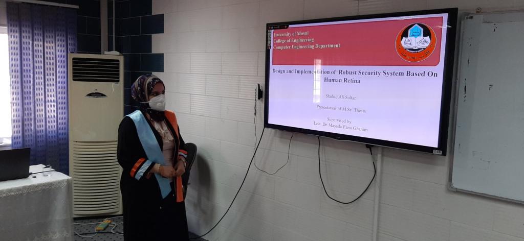 ناقشت رسالة ماجستير في قسم هندسة الحاسوب / كلية الهندسة / جامعة الموصل بعنوان (تصميم وتنفيذ نظام أمني قوي بالأعتماد على شبكية العين البشرية) للطالبة شهد علي سلطان في تمام الساعة التاسعة من يوم الاربعاء الموافق 9-9-2020 على قاعة مناقشات قسم هندسة الميكاترونكس.