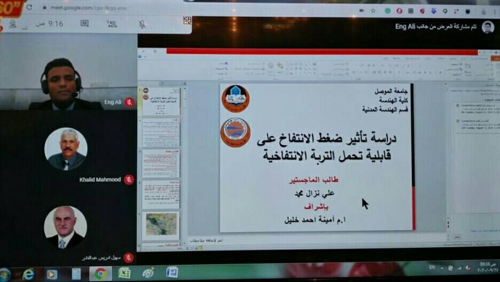 ناقشت رسالة الماجستير في قسم الهندسة المدنية/كلية الهندسة /جامعة الموصل والموسومة ب (دراسة تأثير ضغط الإنتفاخ على قابلية تحمل التربة الإنتفاخية) للطالب (علي نزال محمد) في تمام الساعة التاسعة صباحا من يوم الاحد الموافق(27/9/2020) وعلى رحاب قاعة المناقشة في قسم الهندسة المدنية، وبالإعتماد على التواصل الكترونيا عن بعد مع قسم من اعضاء لجنة المناقشة.