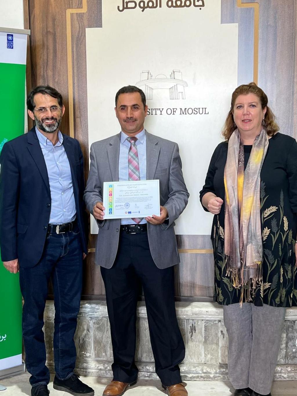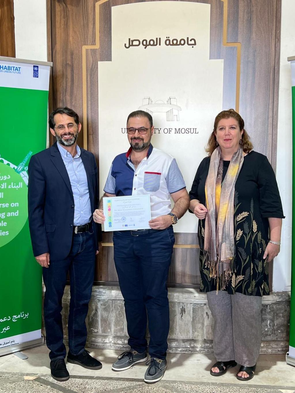 أقامت شُعبة التأهيل والتوظيف والمتابعة في رئاسة جامعة الموصل وبالتعاون مع منظمة الأمم المتحدة للمستوطنات البشرية UN – HABITAT يوم الاحد الموافق 4 آيلول 2022 وعلى قاعة الشعبة بالمنتدى العلمي والادبي، دورة صيفية عن البناء الأخضر، حضر جانباً منها كلا من السيد مساعد رئيس الجامعة للشؤون العلمية الاستاذ الدكتور منير سالم طه والانسة آنا سوافي مديرة عن برنامج المستوطنات البشرية UN – HABITAT.ألقى فيها الخبير الدولي الاستاذ الدكتور عادل العساف من الجامعة الالمانية الاردنية محاضرات علمية عن اهمية الابنية الخضراء والتقنيات المستدامة.يذكر بأن الدورة استمرت اعمالها للمدة من 4-15 أيلول الحالي وبمشاركة مجموعة من اساتذة وخريجي المرحلة الرابعة للكل من كليات الهندسة والعلوم وعلوم البيئة وتقاناتها. بهدف تعزيز المناهج التدريسية الخاصة بالبناء الاخضر والتغير المناخي. فيما قدم بعض من تدريسيي كلية الهندسة محاضرات قيمة عن هذا الموضوع وتناولت محاوره المتعددة، إذ كان الفريق المرشح عن كلية الهندسة هم كل من د.علي نذير عبد الباقي مع د.منى مبارك عبدالله من قسم الهندسة المدنية، د.حسين سلمان عبد الله و د.بسام احسان عبدالقادر من قسم هندسة العمارة، اما من قسم هندسة البيئة، شارك د. عبد الله اسماعيل ابراهيم (رئيس القسم) ود.عمر محمد عبد الكريم وهو ايضا مسؤول وحدة التاهيل والتوظيف والمتابعة في الكلية.وتم في نهاية الدورة توزيع شهادات المشاركة على الاساتذة والطلاب.تأتي هذه الفعالية ضمن برنامج “دعم تعافي العراق واستقرارە عبر التنمية المحلية” المُمول من قبـل الاتحـاد الاوروبي والمُنفذ من قبل برنامج الأمم المتحدة للمستوطنات البشرية UN – HABITAT وبرنامج الأمم المتحدة الإنمائي UNDP.