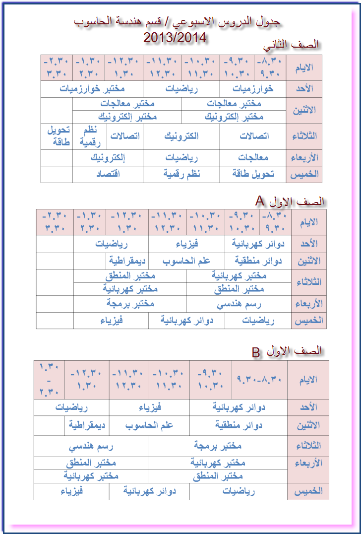 جدول الدروس الاسبوعي / قسم هندسة الحاسوب / 2013/2014