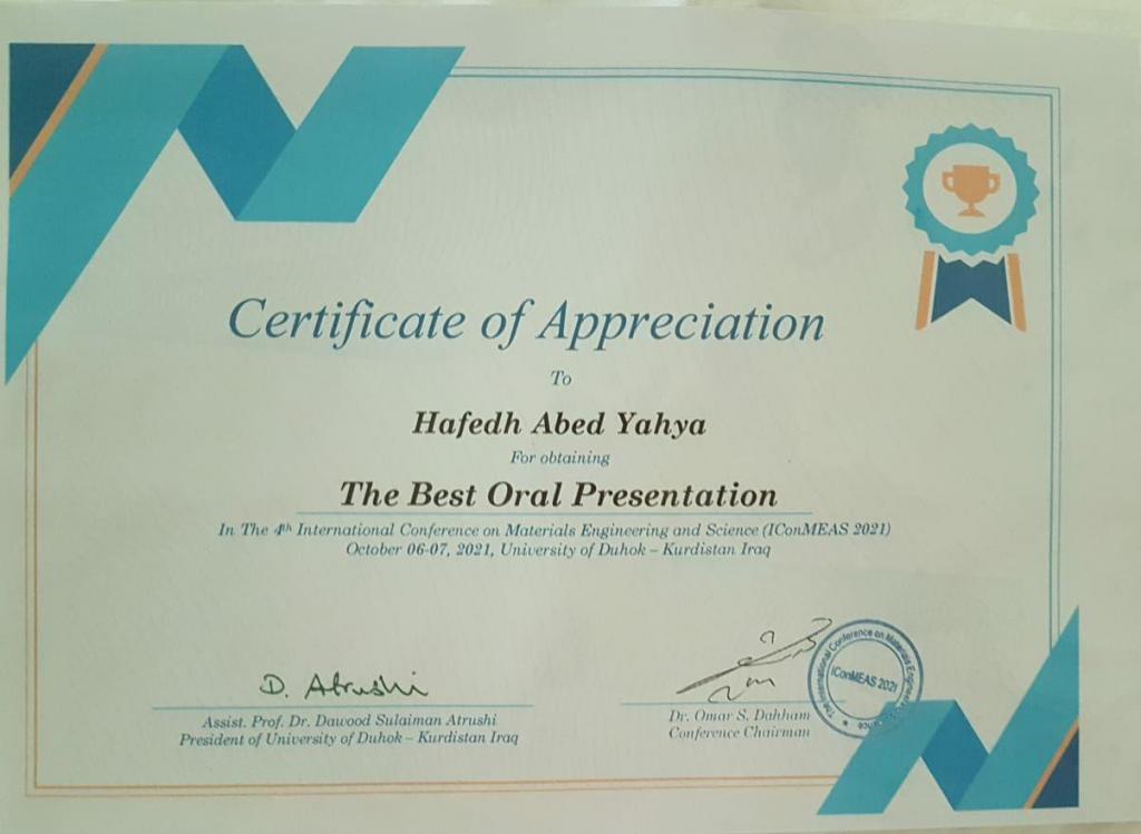 حصل البحث المقدم من قبل د. حافظ عبد يحيى والباحثة فاطمة ذنون محمد في قسم هندسة العمارة في كلية الهندسة على افضل بحث مقدم الى المؤتمر الدولي الرابع في هندسة وعلوم المواد في محافظة دهوك، من بين 69 بحثا وبعنوان (دور خائص مواد البناء في اعادة الاعمار المستدام للمباني السكنة التراثية في مدينة الموصل القديمة). نتمنى للباحثين كل التوفيق في ابراز اسم الكلية في المحافل العلمية.