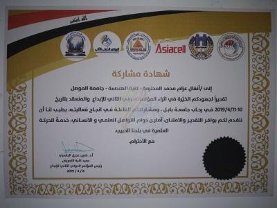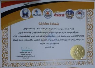 في مسيرة حصاد كلية الهندسة العديد من ﺍﻷﻭﺳﻤﺔ ﻭﺍﻟﺠﻮﺍﺋﺰ والدروع التكريمية لاساتذتها عن نتاجاتهم العلمية، حازت كل من التدريسيتين أ.م نسمة معن محمد ثابت وم.م. أنفال عزام محمد حمودات درع و وسام الإبداع لمشاركتهما ببحث متميز في المؤتمر الدولي الثاني للإبداع،والذي عقد في جامعة بابل… بالتعاون مع ملتقى الإبداع العراقي الدولي تحت شعار (الإبداع يوحد الشعوب)، وبمشاركة واسعة عربية ودولية لباحثين من روسيا واليونان ومصر وليبيا وسوريا والجزائر، فضلا عن باحثين من مختلف الجامعات العراقية.وقد أقيم المؤتمر برعاية معالي وزير التعليم العالي والبحث العلمي الأستاذ الدكتور قصي السهيل، وإشراف رئيس جامعة بابل الأستاذ الدكتور عادل البغدادي، وترأس المؤتمر الأستاذ الدكتور أمين الياسري.وقد أشار رئيس الجامعة في كلمته الافتتاحية إلى إنّ "وضع جامعاتنا ومراكز بحوثنا يتطلب من العلماء والباحثين وأساتذة الجامعات والطلبة جهدًا مميزًا للاستفادة بالحد الأقصى من عولمة العلوم والمعلومات ومصادرها، كما يتطلب التلاقي مع مستويات النظام التعليمي المختلفة لتطوير وتحسين أداء مؤسسات التعليم العالي، من خلال تنمية أساليب مبتكرة في التعليم والتعلم، وتطوير البناء التحليلي لنظام التعليم العالي للإبداع، وتعزيز الشراكة مع الجامعات الأخرى لتحقيق التعليم العالي الفعال، وإدارة منظومة الإبداع بجعلها أكثر استجابة للتغييرات في مجال التعليم العالي، واستخدام التقنيات الجديدة في الممارسات الإبداعية". ومن هنا يسر كلية الهندسة تهنئة كل من التدريسيتين أ.م نسمة معن محمد ثابت وم.م. أنفال عزام محمد حمودات لنيلهما درع ووسام الإبداع الدولي.