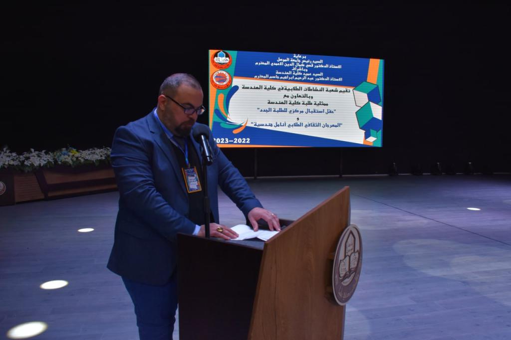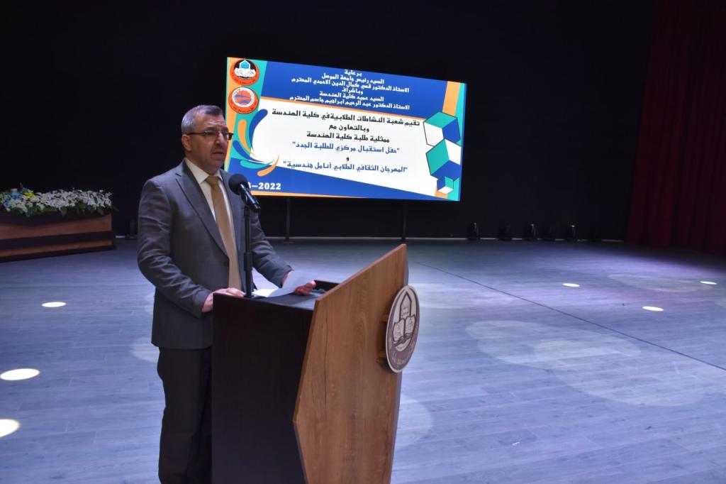 برعاية السيد رئيس جامعة الموصل الاستاذ الدكتور قصي كمال الدين الاحمدي المحترم وبحضور السيد مساعد رئيس جامعة الموصل للشؤون العلمية الاستاذ الدكتور منير سالم البدراني المحترم اقامت كلية الهندسة حفلا مركزيا لأستقبال طلبتها الجدد والذي نظمته شعبة النشاطات الطلابية بالتعاون مع عدد كبير من الطلبة المبدعين في مجالات علمية وفنية في كلية الهندسة. والقى السيد عميد كلية الهندسة الأستاذ الدكتور عبد الرحيم ابراهيم جاسم المحترم كلمة اشاد بدور السيد رئيس جامعة الموصل المحترم ودعمه المتواصل واللامحدود لكلية الهندسة. كما ورحب بجميع الضيوف الكرام ومتمنيأَ وداعيأَ المولى الكريم أن يجعله عام خير وفلاح ونجاح للجميع وأن يحققوا ما تصبوا اليه انفسهم من آمال وطموحات في ظل منافسة شريفة في طلب العلم والتفوق وتحقيق علاقات اخوية طيبة محافظين على الامانة العلمية واشاعة روح المنافسة الشريفة في طلب العلم والتفوق.بعدها تم افتتاح المعرض الذي اقيم برعاية السيد رئيس جامعة الموصل المحترم من قبل السيد مساعد رئيس الجامعة للشؤون العلمية وبأشراف السيد عميد الكلية وبحضور السادة المعاونين وورؤساء الاقسام العلمية المحترمون كافة.تضمن المعرض مجموعة رائعة من اللوحات الفنية المعبرة والاعمال اليدوية والمجسمات الهندسية التي هي من نشاطات طلبة كلية الهندسة والتي بدورها تعبر عن مدى التطور الثقافي والفني والمستوى الفكري للطلبة.وفي ختام المهرجان اثنى السيد مساعد رئيس الجامعة على الجهود الفنية والتشكيلية القيمة من قبل المشاركين في المعرض وشكر ايضاً جميع القائمين على هذا المعرض المتميز.