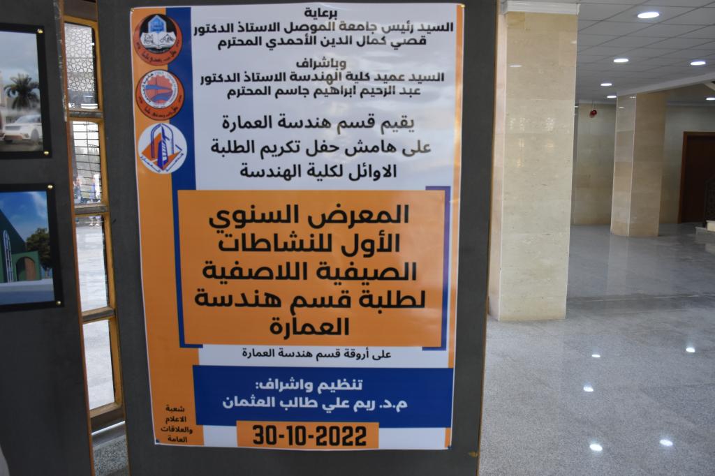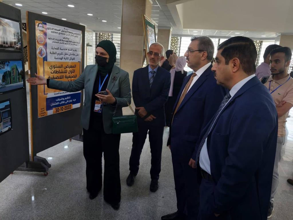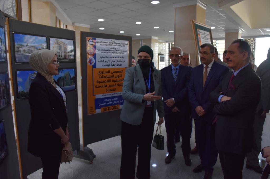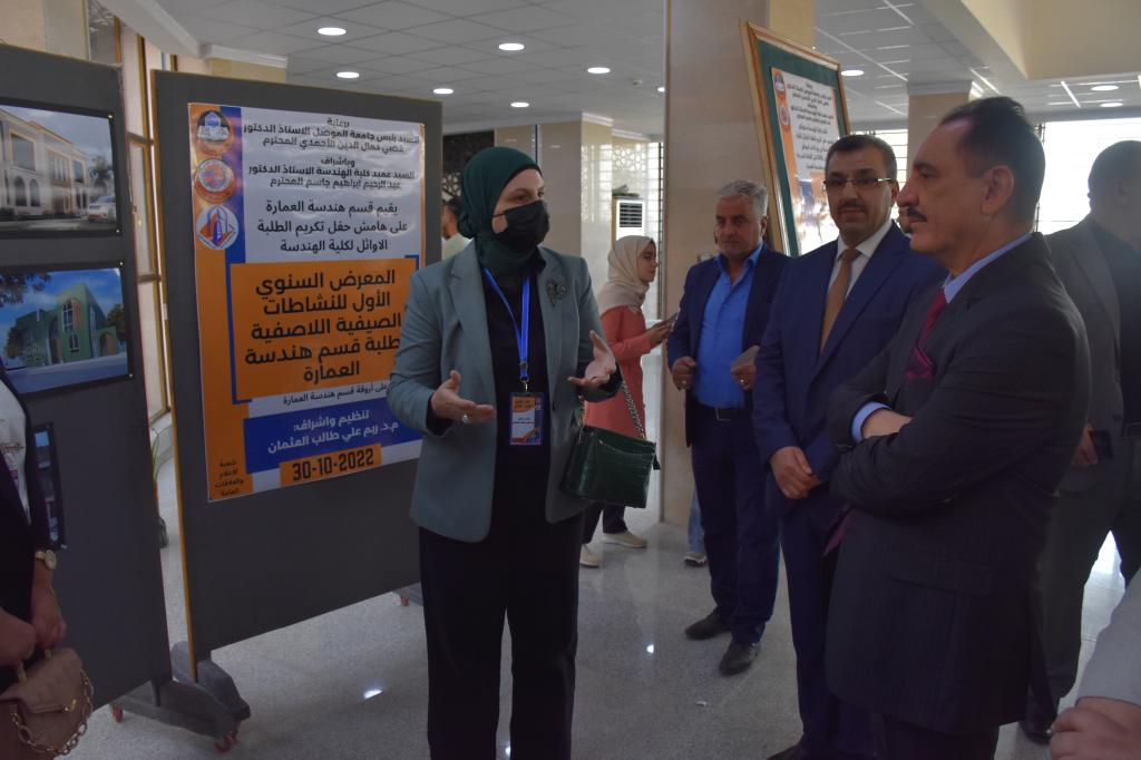 وعلى هامش حفل تكريم الطلبة الاوائل افتتح السيد رئيس الجامعة المحترم والسيد عميد الكلية المحترم المعرض السنوي لقسم هندسة العمارة للنشاطات الصيفية اللاصفية لطلبة قسم هندسة العمارة والذي اشرف على ادارته م.د. ريم علي طالب العثمان التدريسية في كلية الهندسة.