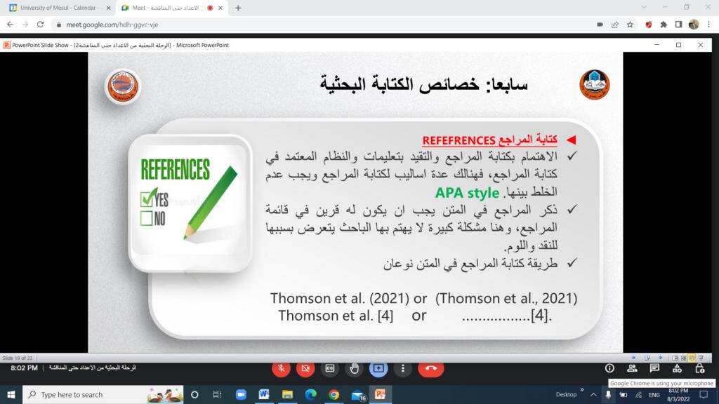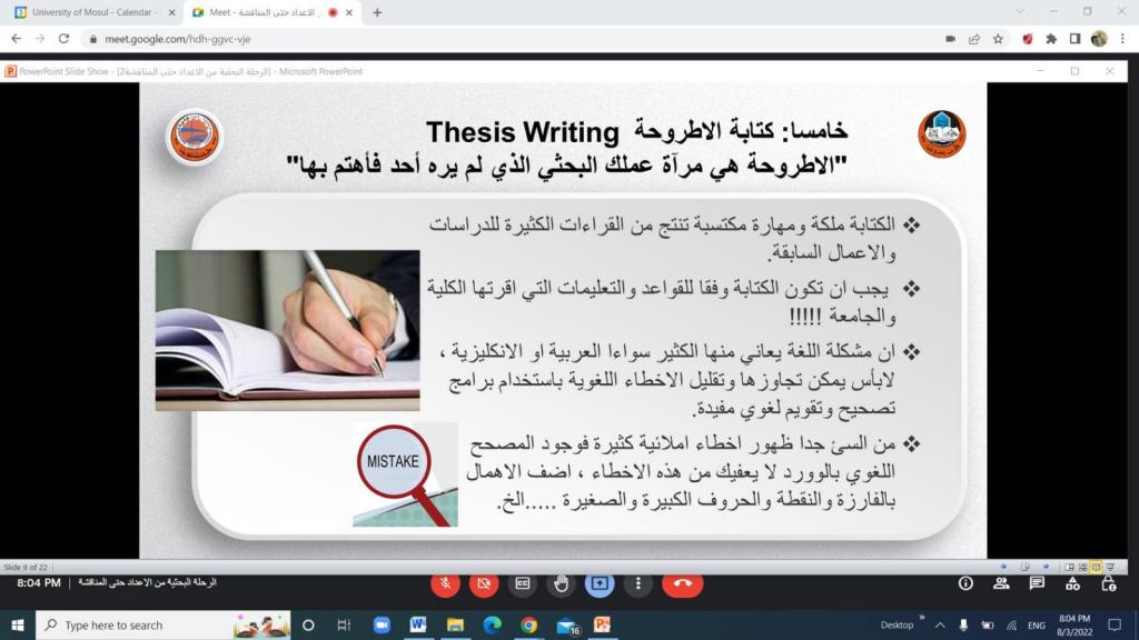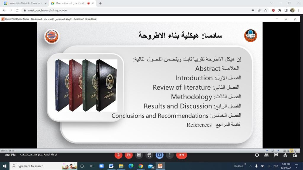 بحضور السيد عميد كلية الهندسة المحترم تم اقامة حلقة نقاشية الكترونية لطلبة الدراسات العليا بعنوان (الرحلة البحثية من الاعداد حتى المناقشة) وذلك في مساء يوم الثلاثاء الموافق 02/08/2022 وعلى منصة الـ Meet.هدفت الحلقة الى اطلاع الباحثين في الدراسات العليا الى الطريق السليم في البحث العلمي واجتياز العقبات وتخطي الاخطاء التي يمكن ان يقع فيها طالب العلم.كما تضمنت هذه الحلقة النقاشية وصف الخطوات الاساسية في العمل البحثي ابتداءا من اختيار موضوع البحث ثم الابحار فيه من خلال الاطلاع على الادبيات السابقة وتجارب السابقين من الباحثين لتحديد الفجوة البحثية واختيار المنهجية المناسبة للوصول لاهداف البحث. كما تم التطرق الى هيكلية الاطروحة والنقاط الاساسية التي يجب مراعاتها عند الكتابة البحثية. واخيرا تم استعراض واقع المناقشات والاعداد لها وكيفية الرد على الممتحنين.وفي اخر الجلسة تم فتح باب النقاش والرد على اسئلة واستفسارات الطلبة التي تدور بخلدهم وما يشكل عليهم.