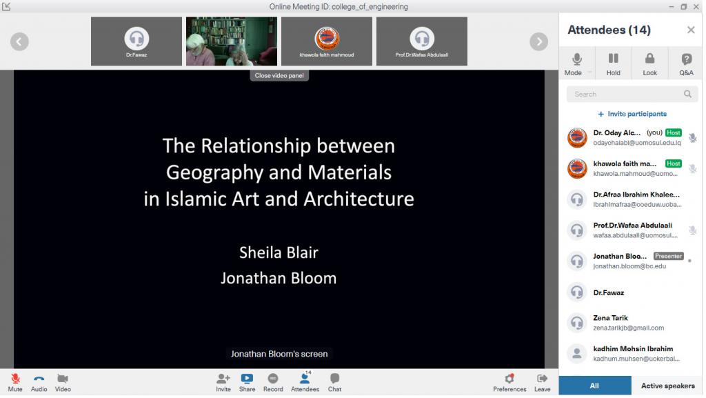 وباستخدام البرنامج التفاعلي FCC وذلك في تمام الساعة 9:00 مساء من يوم الأربعاء الموافق 10/6/2020. القى هذه الدورة كل من أ. د. شيلا بلير وأ. د. جوناثن بلووم وهما استاذي الفن والعمارة الإسلامية والاسيوية في جامعة بوسطن وجامعة كالروود والحاصل على كرسي حمد بن جاسم للفن والعمارة الإسلامية وقتم بتقديم الدورة والترجمة أ. د. وفاء عبد اللطيف. تضمنت الدورة شرح وتناول العلاقة بين الموقع الجغرافي ومواد البناء في العمارة الاسلامية وايضا بيان اهم خصائص العمارة الاسلامية والتي اكدت على الاستدامة من خلال استخدام المواد المحلية بالاضافة الى المعالجات المناخية،حيث ناقش المحاضرين نماذج متنوعة من الابنية العمرانية في مختلف دول العالم الاسلامي ـوقد حضر الدورة المهتمين بالعمارة الاسلامية من مختلف جامعات العراق وقد طرح المشاركين العديد من الاسئلة على المحاضرين الذين كانو سعداء جدا في تواجدهم ـواستعدادهم للتعاون المستقبلي ورغبتهم بزيارة الموصل قريبا لالقاء محاضررات مباشرة للمهتمين في جامعة الموصل.