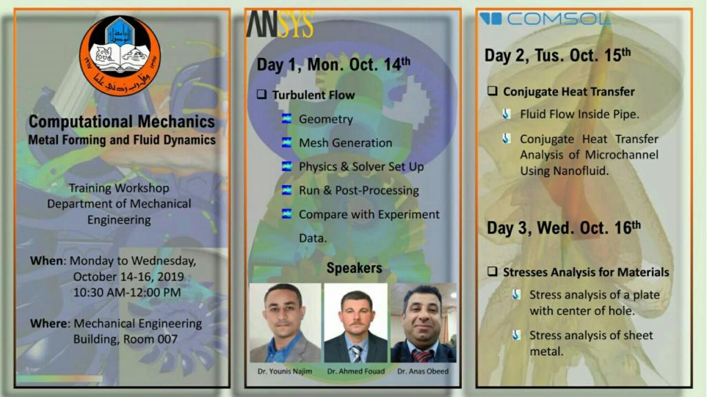 من ضمن النشاطات العلمية لقسم الهندسة الميكانيكية إقيمت دورة تطويرية تحت عنوان ( استخدام برنامج الكومسل في مجال الهندسة الميكانيكية).ولمدة ثلاثة أيام اعتباراً من يوم الاثنين الموافق 14-10-2019 ولغاية 16-10-2019 .ومن الساعة 10.30صباحاً وإلى الساعة 12 ظهراًمحاور الدورة:-