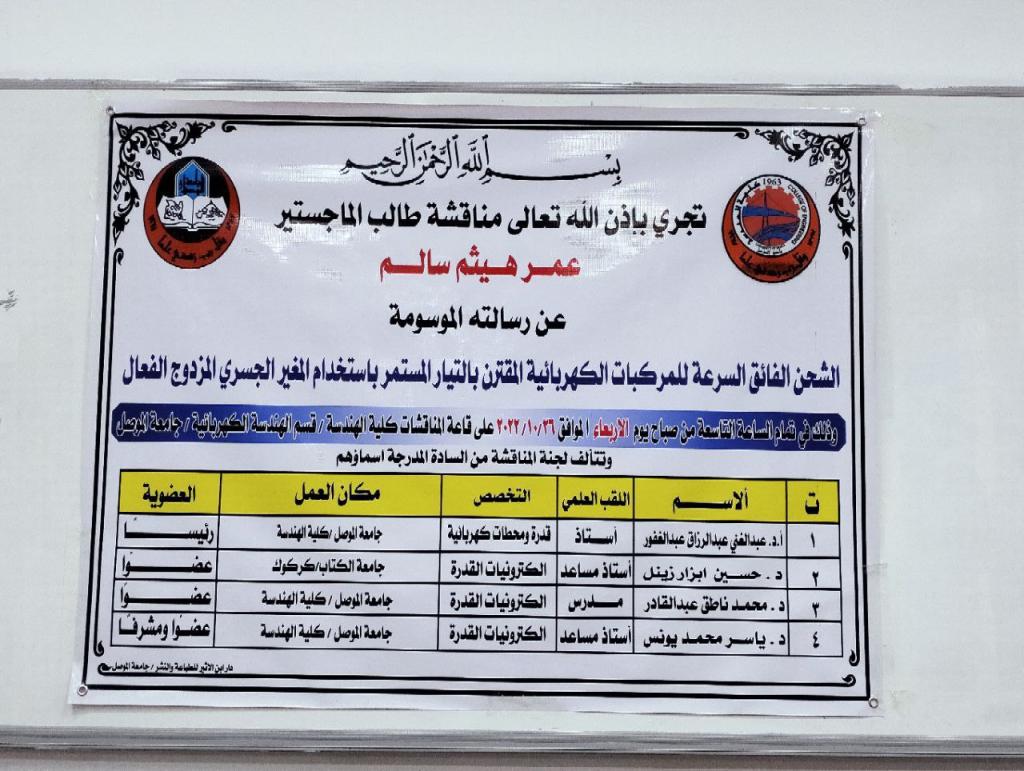 تمت مناقشة رسالة ماجستير في قسم الهندسة الكهربائية بجامعة الموصل بعنوان “الشحن فائق السرعة للمركبات الكهربائية المقترن بالتيار المستمر باستخدام المغير الجسري المزدوج الفعال” للطالب عمر هيثم سالم باشراف أ.م.د. ياسر محمد يونس أمين في تمام الساعة التاسعة من يوم الأربعاء الموافق 2022/10/26.