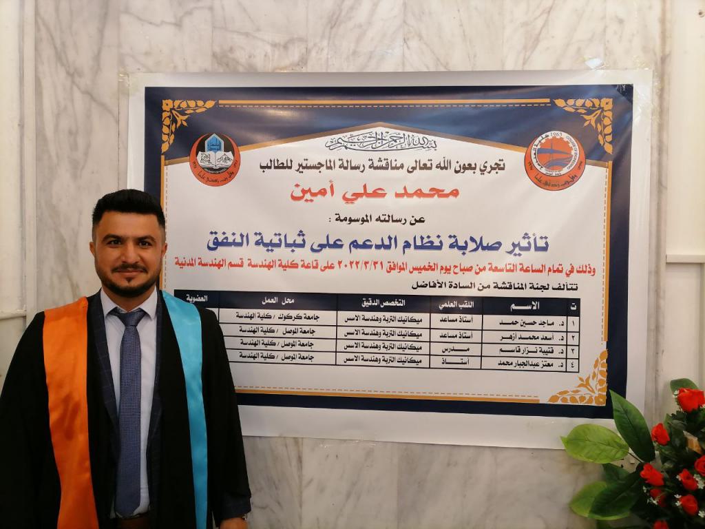 نوقشت رسالة ماجستير في قسم الهندسة المدنية بجامعة الموصل بعنوان “تأثير صلابة نظام الدعم على ثباتية النفق” للطالب محمد علي امين في تمام الساعة التاسعة من يوم الخميس الموافق 31/03/2022.
