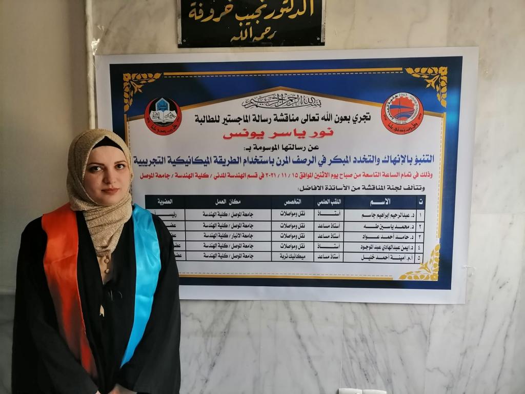 نوقشت رسالة ماجستير في قسم الهندسة المدنية في جامعة الموصل بعنوان “التنبؤ بالانهاك والتخدد المبكر في الرصف المرن باستخدام الطريقة الميكانيكية التجريبية” للطالبة نور ياسر يونس في تمام الساعة التاسعة من يوم الاثنين الموافق 15/11/2021.