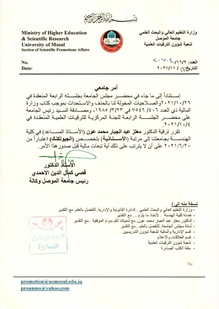 ترقية علمية لتدريسي من قسم الهندسة المدنية الى مرتبة الاستاذية