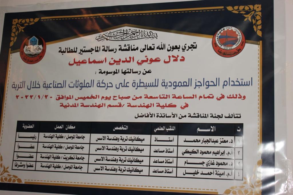 نوقشت رسالة ماجستير في قسم الهندسة المدنية بجامعة الموصل بعنوان “إِستخدام الحواجز العمودية للسيطرة على حركة الملوثات الصناعية خلال التربة” للطالبة دلال عوني الدين اسماعيل في تمام الساعة التاسعة من يوم الخميس الموافق 20/01/2022.