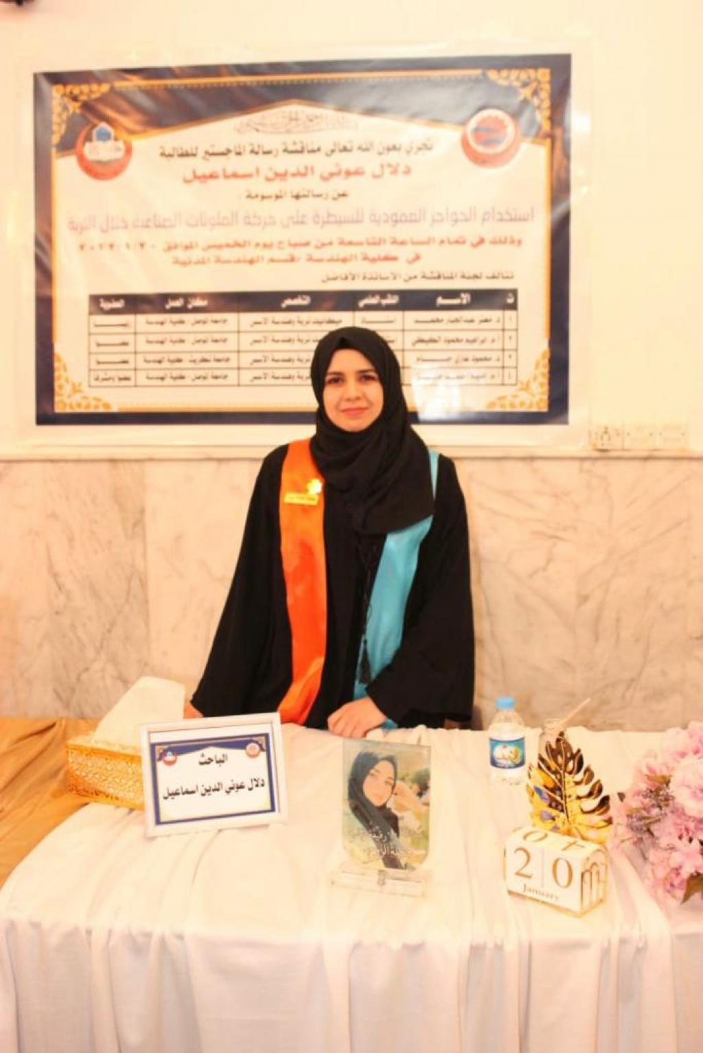 وقد تألفت لجنة المناقشة من أ. د. معتز عبدالجبار محمد رئيسا وأ.م. د. ابراهيم محمود الكيكي عضوا وأ.م. د. محمود غازي جسام عضوا، والانسة أ.م امينة احمد خليل عضوا ومشرفا.