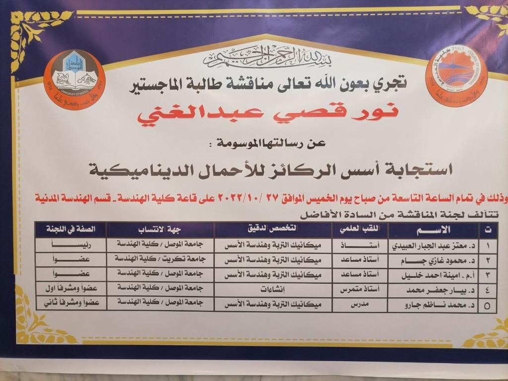 تمت مناقشة رسالة ماجستير في قسم الهندسة المدنية / جامعة الموصل بتخصص ميكانيك التربة وهندسة الاسس، بعنوان “استجابة أسس الركائز للحمل الديناميكي” للطالبة نور قصي عبد الغني وباشراف مشترك لكل من الاستاذ الدكتور بيار جعفر السليفاني والدكتور محمد ناظم جارو في يوم الخميس الموافق 27/10/2022. وذلك بحضور السيد مساعد رئيس جامعة الموصل للشؤون العلمية الاستاذ الدكتور منير سالم البدراني والسيد عميد كلية الهندسة الاستاذ الدكتور عبد الرحيم ابراهيم جاسم.تم حساب السعة العمودية لنظام متكون من مجموعه ركائز مع غطاء للركيزة تحت تأثير الحمل الديناميكي للماكينة بالطريقة التحليلية باستخدام بعض المعادلات الخاصة وبالطريقة العددية باستخدام برنامج (PLAXIS 3D V.20).وقد تمت دراسة تأثير كلا من التردد التشغيلي للماكينة، قطر الركيزة، طول الركيزة، نسبه عمق دفن غطاء الركيزة وكذلك بعد الطبقة الصخرية من سطح الارض على السعه العمودية للنظام.وجد انه بشكل عام وباستخدام الطريقة التحليلية تقل السعه العمودية العظمى للنظام بزيادة قطر الركيزة، طولها، نسبه دفن غطاء الركيزة وبنقصان بعد الطبقة الصخرية. خلافًا للطريقة التحليلية فان الإزاحة العمودية العظمى المحسوبة بالطريقة العددية تزداد بزيادة قطر الركيزة.يمكن ايضا ملاحظة انه نسبة التردد التشغيلي الى التردد الطبيعي للنظام التي تقابل اقصى سعة عمودية تتناقص، بمعنى اخر يبتعد النظام عن حالة الرنين وذلك بزيادة قطر الركيزة ونسبة دفن غطاء الركيزة.كما تم حساب القيمة المقاسة لمعرفه كفاءة النظام تحت الحمل الديناميكي للماكينة. أشارت النتائج إلى أن القيمة المقاسة تزداد بزيادة قطر الركيزة. ايضا القيمة المقاسة للنظام في حاله غطاء الركيزة السطحي أقل من القيمة المقاسة في حالة الغطاء المدفون.تألفت لجنة المناقشة من الدكتور معتز عبدالجبار العبيدي (رئيساً) والدكتور محمود غازي جسام (جامعة تكريت / عضواً) والأستاذ المساعد امينة احمد خليل (عضواً) بالإضافة إلى الاستاذ الدكتور بيار جعفر السليفاني (عضواً ومشرفاً اول) والدكتور محمد ناظم جارو (عضواً ومشرفاً ثان). وتم بعدها قراءة قرار اللجنة والذي نص على قبول الرسالة مع منح الطالبة درجة الماجستير. مبارك للطالبة والقسم العلمي.