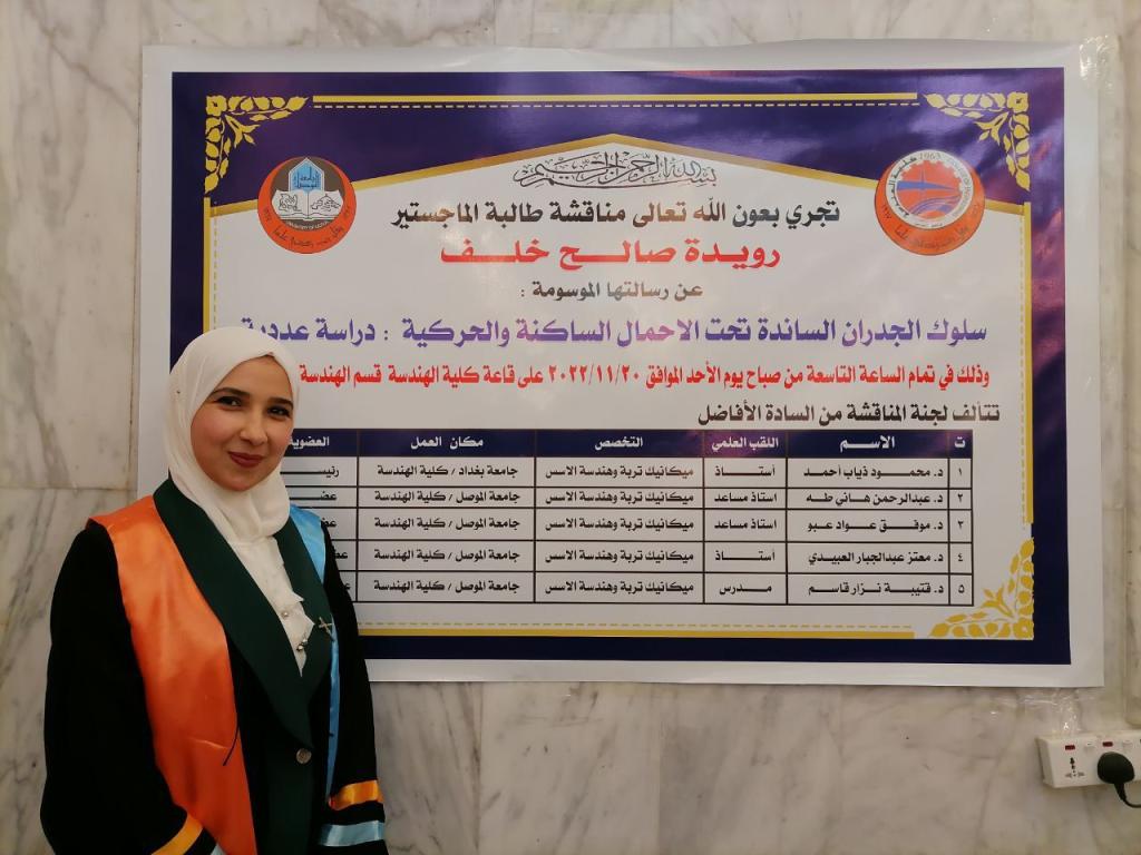 تمت مناقشة رسالة ماجستير في قسم الهندسة المدنية / جامعة الموصل بتخصص ميكانيك التربة وهندسة الاسس، بعنوان “سلوك الجدران الساندة تحت الاحمال الساكنة والحركية: دراسة عددية” للطالبة رويدة صالح خلف الخفاجي وإشراف مشترك من الاستاذ الدكتور معتز عبدالجبار العبيدي والدكتور قتيبة نزار الصفار في يوم الاحد الموافق 20/11/2022.الهدف الأساسي من هذا البحث هو دراسة تأثير المسافة للحمل الخارجي على سلوك الجدار الساند الناتئ تحت التحميل الساكن والحركي باستخدام برنامج العناصر المحددة PLAXIS-2D. تم اخذ العديد من المتغيرات بنظر الاعتبار في هذه الدراسة ومنها مسافة الحمل الخارجي نسبة الى عرض الكعب للجدار بنسب، وشدة الهزة الأرضية. تضمنت الدراسة ايضا تأثير نوع تربة الردم (رمل وطين) حيث تمت نمذجتها بالأخذ بنظر الاعتبار التخميد الهستيري. بالإضافة الى ذلك تمت دراسة تأثير ارتفاع الجدار.بينت النتائج السلوك المعقد للجدار الساند الناتئ تحت الظروف الساكنة والحركية. بشكل عام سلوك الجدار الساند الناتئ من ناحية تغيير مسافة الحمل الخارجي يصبح أكثر وضوحا كلما قل ارتفاع الجدار. في الظروف الساكنة يكون النقصان في ضغط الأرض الناتج عن تحريك الحمل الخارجي بعيدا عن الجدار هو 44، 30 و17% لجدار ساند بارتفاع 5، 6 و 7م على التوالي يسند تربة رملية. بينما للتربة الطينية تصبح هذه النسب 33، 20 و8.3%. في الظروف الحركية، النقصان في ضغط الأرض هو 43.6، 32.4 و21.5% لجدار بارتفاع 5، 6 و 7م على التوالي مع تربة رملية، والتي تصبح 33.3، 20.3 و16% مع التربة الطينية. زيادة شدة الهزة الأرضية تؤدي الى زيادة قليلة في الضغط الجانبي للتربة عندما يكون الحمل الخارجي قريب من الجدار.تألفت لجنة المناقشة من الاستاذ الدكتور محمود ذياب احمد من جامعة بغداد / كلية الهندسةرئيساً للجنة وعضوية كل من الأستاذ مساعد الدكتور عبدالرحمن هاني طهوالدكتور الاستاذ مساعد الدكتور موفق عبو عواد بالإضافة إلى الاستاذ الدكتور معتز عبدالجبار العبيدي(عضواً ومشرفاً اول) والدكتور قتيبة نزار الصفار (عضواً ومشرفاً ثانٍ).وتم بعدها قراءة قرار اللجنة والذي نص على قبول الرسالة مع منح الطالبة درجة الماجستير. مبارك للطالبة والقسم العلمي. وعطاء مستمر للجنة العلمية.
