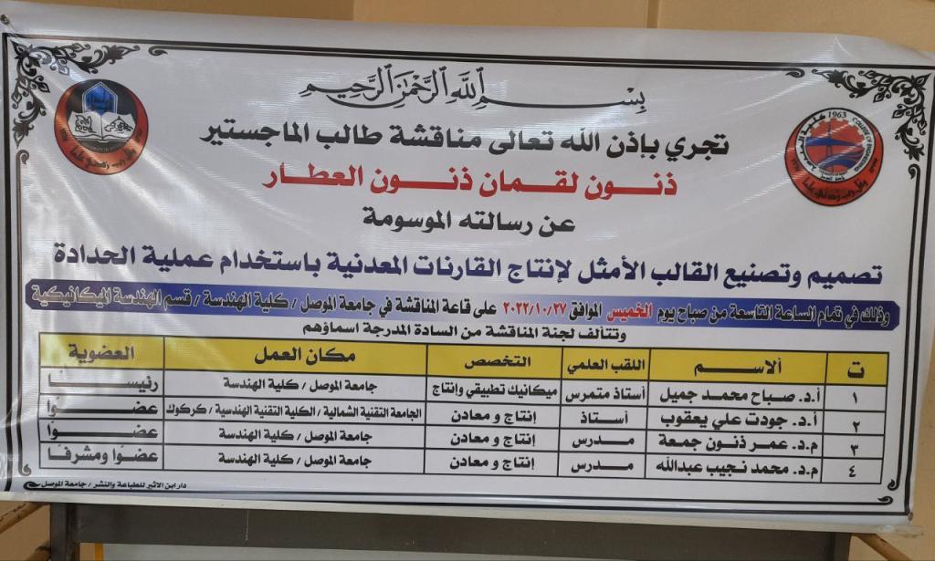 تمت مناقشة رسالة ماجستير في قسم الهندسة الميكانيكية بجامعة الموصل بعنوان “تصميم وتصنيع القالب الأمثل لإنتاج القارنات المعدنية باستخدام عملية الحدادة” للطالب ذنون لقمان ذنون العطار باشراف د. محمد نجيب عبد الله في تمام الساعة التاسعة من يوم الخميس الموافق 27/10/2022.تضمنت هذه الدراسة تصميم مجموعة من القوالب الخاصة لتشكيل القارنة المشفهة باستخدام برنامج (Auto CAD)، ومن ثم استخدم برنامج محاكاة (DEFORM 3D) لتنفيذ عملية التشكيل بالحدادة ان الهدف من هذا البحث هو تصميم وتصنيع أفضل قالب معدني لإنتاج قارنة مشفهه (Flange Coupling) بعملية التشكيل بالحدادة على الساخن في قالب مغلق نظريا باستخدام المحاكاة للوصول الى أفضل تصميم لقالب تشكيل القارنة من خلال دراسة احمال التشكيل، الاجهادات، الانفعالات، حركة جزيئات المعدن للحصول على معدل انسياب جيد للمعدن داخل تجويف القالب والتنبؤ بالعيوب قبل حدوثها وتجاوزها ومن ثم تصنيع القالب الأفضل وتنفيذ عملية التشكيل بالحدادة عملياً.تألفت لجنة المناقشة من أ.د. صباح محمد جميل رئيساً وعضوية كل من أ.د. جودت علي يعقوب ود. عمر ذنون جمعة ود. محمد نجيب عبد الله عضوا ومشرفاً.وبعدها قرأ قرار لجنة المناقشة وتضمن قبول الرسالة مع منح الطالب درجة الماجستير. مبارك للطالب والقسم العلمي.