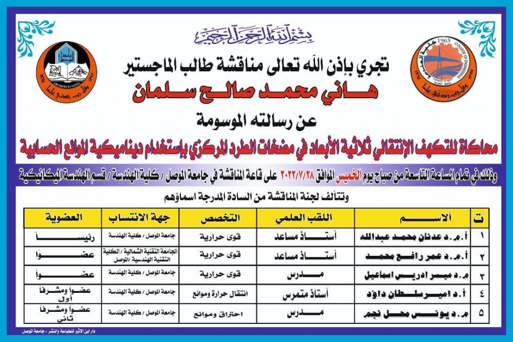 تمت مناقشة رسالة ماجستير في قسم الهندسة الميكانيكية بجامعة الموصل بعنوان “محاكاة للتكهف الانتقالي ثلاثية الابعاد في مضخات الطرد المركزي باستخدام ديناميكية الموائع الحسابية” للطالب هاني محمد صالح سلمان عبد الله في تمام الساعة التاسعة من يوم الخميس الموافق ٢٨ / ٧ /٢٠٢٢ وعلى قاعة الدراسات العليا.تم تحليل خط الوسط للتصميم الأولي لمضخة الطرد المركزي، وإنشاء نموذج للمضخة ثلاثي الأبعاد باستخدام منحني (Bezier) متعدد الحدود الذي يربط المَعلمَات الهندسية الرئيسة للمدخل والمخرج التي تم الحصول عليها من حسابات طريقة تحليل خط الوسط وإنشاء شكل المحور والغطاء والريشة.تساعد طريقة تصميم خط الوسط في معرفة خطوات التصميم وظروف التشغيل التي تشتمل على سرعة المُكرِه 2900 دورة في الدقيقة، وسعة تدفق المضخة 60 متر مكعب / ساعة، وارتفاع عمود السائل المجهَّز من قبل المضخة 39 متراً. ومِن ثَمَّ تم إجراء تحليل باستخدام ديناميكية الموائع الحسابية ثلاثية الأبعاد لدراسة بداية وتطور التكهّف في مُكرِه مضخة الطرد المركزي في ظل ظروف تشغيل متغيرة.تمّ تخفيض الضغط الكلي للمدخل بمرور الوقت، من مقدار مساوٍ لقيمة الضغط الجوي إلى نقطة تطور التكهّف بالكامل في مُكرِه المضخة، إلى أن يتم حصول الانهيار في ارتفاع عمود السائل المجهَّز من قبل المضخة لقيمة قريبة من الصفر.ولدراسة تأثير سرعة المُكرِه ومعدل تدفق المضخة على التكهّف تم تغيير سرعة المُكرِه من 2000 إلى 3500 دورة في الدقيقة، وكذلك تغيير معدل سرعة تدفق المضخة من 0.5 إلى 1.5 في ظل التخفيض التدريجي المستمر بمرور الوقت للضغط الكلي للمدخل.أظهرت النتائج أن ارتفاع عمود السائل المجهّز من قبل المضخة والكفاءة الهيدروليكية التي تنبأت بها ديناميكية الموائع الحسابية أقل من تلك التي تم الحصول عليها عبر طريقة تحليل خط الوسط بسبب الخسائر الناجمة من السريان ثلاثي الأبعاد للمائع مثل التدفق العكسي والتدفق الدوّامي، فضلاً عن خسائر اللزوجة وتغير التدفق في الاتجاه الممتد للمُكرِه، وكشفت نتائج ديناميكية الموائع الحسابية عن ثلاث مراحل متميزة من تطور التكهّف في المضخة التي تخضع لانخفاضٍ في ضغط المدخل بمرور الوقت، تظهر المرحلة الأولى بداية التكهّف، وفيها لم يلاحظ تأثير على ارتفاع عمود السائل المجهز من قبل المضخة. وأظهرت المرحلة الثانية النمو السريع وانتشار التكهّف على طول جانب الشفط من الحافّة الامامية حتى الحافة الخلفية لريشة المُكرِه، وأخيراً المرحلة الثالثة والتي عندها مَلَئَ التكهّف المسافة بين الريشات وانخفاض عمود السائل المجهّز من قبل المضخة إلى قيمة قريبة من الصفر.تُظهر معدلات تدفق الماء المختلفة للمضخة تأثيراً كبيراً على التكهّف في جميع المراحل، ويتسارع التكهّف في جميع المراحل مع زيادة معدل التدفّق للمضخة، ومع ذلك لم يتم العثور على تأثير كبير على تطور التكهّف من خلال تغيير سرعة المُكرِه، ويلاحظ ان التدفق للماء يسلك سلوكاً عاماً في طبيعة جريانه في المرحلة الاولى، ثم يتطور الى التدفق الدوّامي (الدوران) في المرحلة الثانية، والعودة إلى التدفق االانسيابي خلال المرحلة الثالثة بفضل إزاحة المزيد من التدفق بسبب الزيادة الهائلة في الحجم النوعي.تالفت لجنة المناقشة من ا.م.د. عدنان محمد عبد الله رئيساً وعضوية كل من أ.م.د. عمر رافع محمد و م.د. ميسر ادريس إسماعيل والأستاذ المتمرس د. امير سلطان داؤد عضواً ومشرفاً اول و م.د. يونس محل نجم عضواً ومشرفاً ثانٍ. وبعدها تمت قراءة قرار لجنة المناقشة وتضمن قبول الرسالة مع منح الطالب درجة الماجستير. مبارك للطالب والقسم العلمي.