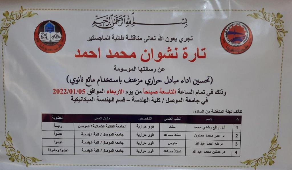 تمت مناقشة رسالة ماجستير في قسم الهندسة الميكانيكية بجامعة الموصل بعنوان “تحسين اداء مبادل حراري مزعنف بإستخدام مائع نانوي” للطالبة تارة نشوان محمد أحمد في تمام الساعة التاسعة من يوم الأربعاء الموافق 5/1/2022.