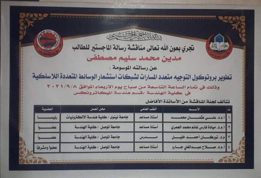 نوقشت في كلية الهندسة / قسم هندسة الحاسوب بجامعة الموصل رسالة ماجستير عن تطوير بروتوكول التوجيه متعدد المسارات لشبكات استشعار الوسائط المتعددة اللاسلكية، وذلك في يوم الاربعاء الموافق 8 ايلول 2021، حضر جانبا منها الاستاذ المساعد الدكتور أحمد مامون فاضل رئيس القسم وعدد من تدريسيي القسم.