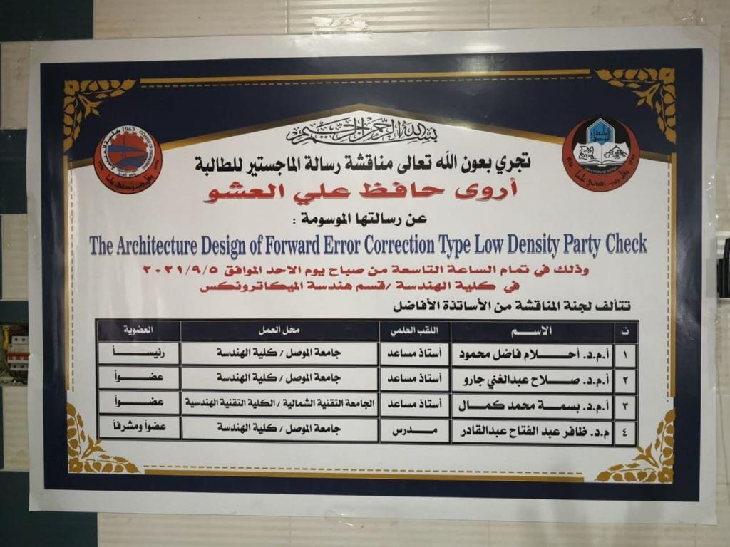 نوقشت في كلية الهندسة / قسم هندسة الحاسوب بجامعة الموصل رسالة ماجستير عن التصميم المعماري لتصحيح الخطأ المسبق نوع فحص التكافؤ منخفض الكثافة، يوم 5 أيلول 2021، حضر جانبا منها الاستاذ الدكتور قصي الأحمدي رئيس جامعة الموصل وعميد الكلية الأستاذ الدكتور بيار جعفر السليفاني ورئيس القسم الدكتور أحمد مأمون فاضل وعدد من تدريسيي الكلية.
