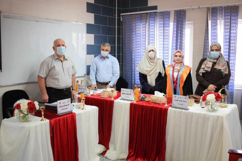 ترأس لجنة المناقشة الأستاذ المساعد الدكتورة احلام فاضل محمود وعضوية كل من الاستاذ المساعد الدكتور صلاح عبد الغني جارو والاستاذ المساعد الدكتورة بسمة محمد كمال وباشراف وعضوية الدكتور ظافر عبد الفتاح عبد القادر. وبنهاية المناقشة قرئ قرار اللجنة الذي اوصى بقبول الرسالة.