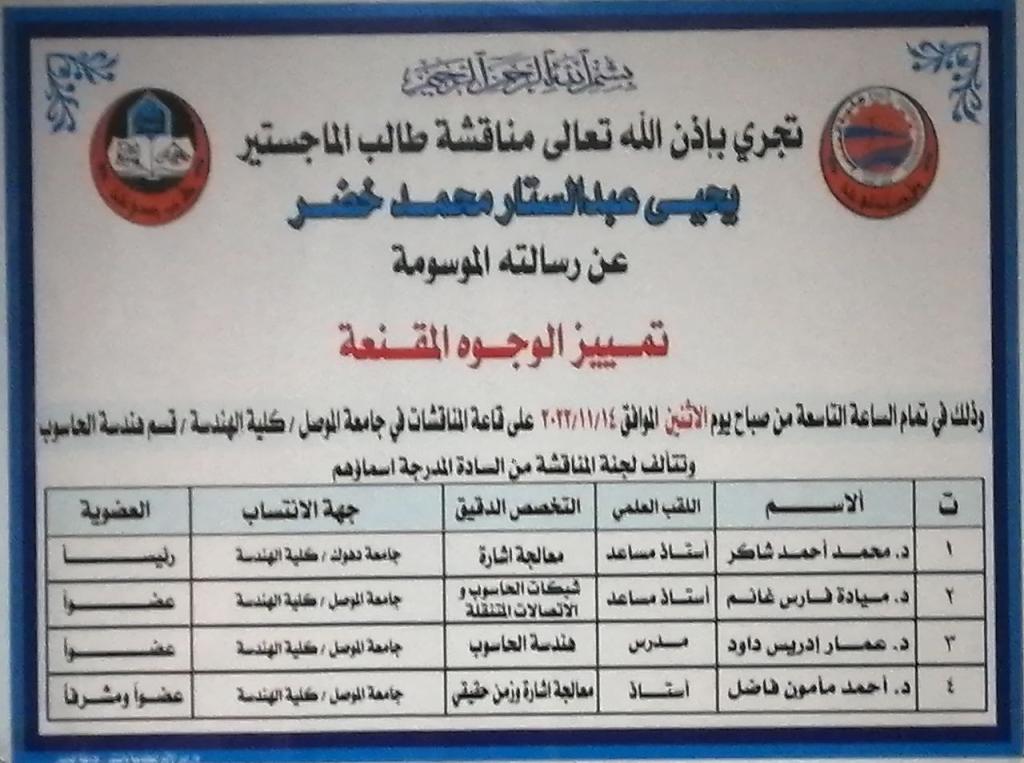تمت مناقشة رسالة ماجستير في قسم هندسة الحاسوب / بجامعة الموصل بعنوان “تمييز الوجوه المقنعة” للطالب يحيى عبد الستار محمد خضر في تمام الساعة التاسعة من يوم الإثنين الموافق 2022/11/14 وعلى قاعة المناقشات في قسم هندسة الميكاترونكس.