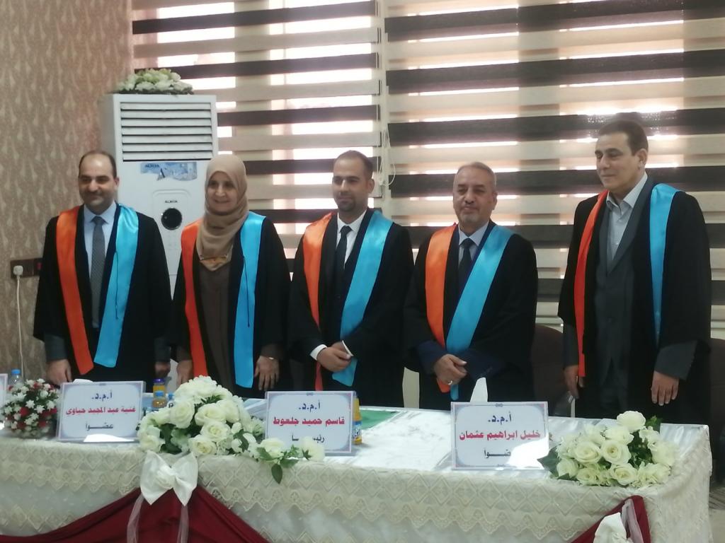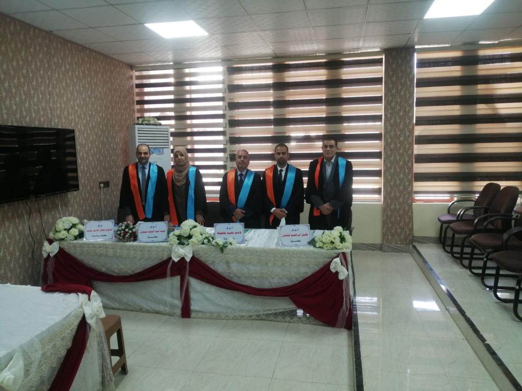 تالفت لجنة المناقشة من أ. م. د. قاسم حميد جلعوط رئيسا وأ. م. د. غنية عبد المجيد حياوي عضوا وأ. م. د. خليل ابراهيم عثمان عضوا فضلا عن م. د. نشوان كمال الدين محمد عضوا ومشرفا، انتهت جلسة المناقشة باعلان قبول الرسالة ومنح الطالب درجة الماجستير.
