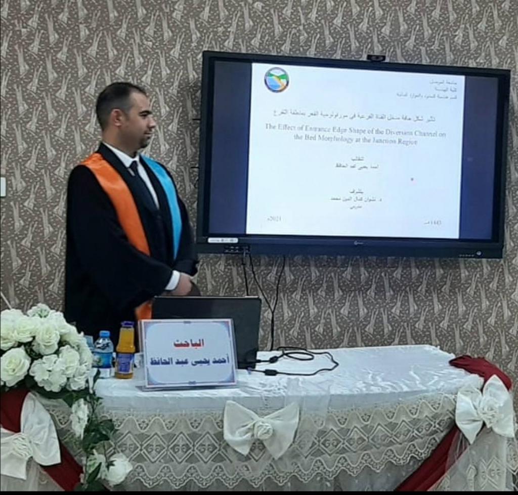 نوقشت رسالة ماجستير في قسم هندسة السدود والموارد المائية في جامعة الموصل بعنوان “تأثير شكل حافة مدخل القناة الفرعية في مورفولوجية القعر بمنطقة التفرع” للطالب احمد يحيى عبد الحافظ في تمام الساعة التاسعة من يوم الاثنين الموافق 1/11/2021.