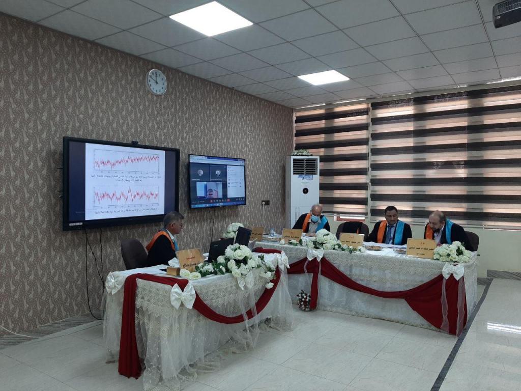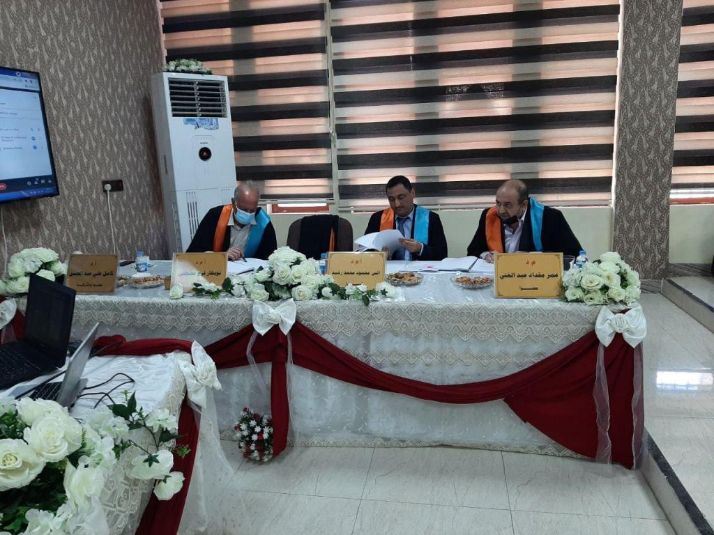 تالفت لجنة المناقشة تألفت من أ. م. د. انس محمود محمد رئيسا لها وضمت في عضويتها كل من أ. م. د. نوبهار فرج مصطفى وم. د. عمر مقداد عبد الغني عضوا اما أ. د. كامل علي عبد المحسن فكان عضوا ومشرفا. انتهت المناقشة بقبول الرسالة ومنح الطالب درجة الماجستير.