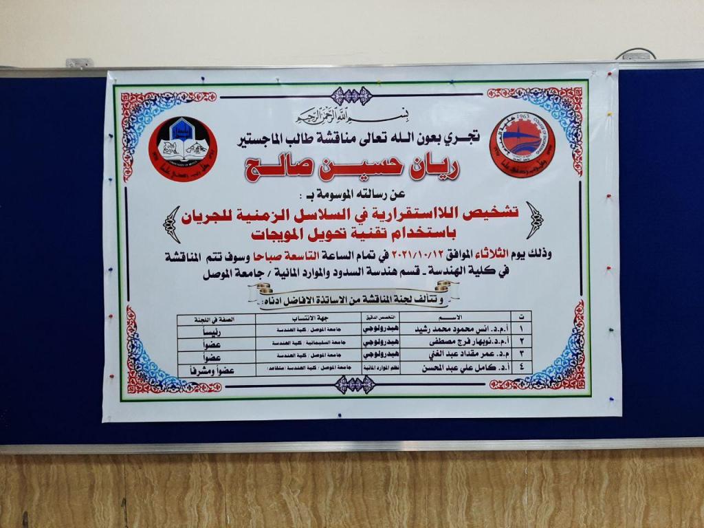 نوقشت رسالة ماجستير في قسم هندسة السدود والموارد المائية في جامعة الموصل بعنوان “تشخيص اللااستقرارية في السلاسل الزمنية للجريان باستخدام تقنية تحويل المويجات” للطالب ريان حسين صالح في تمام الساعة التاسعة من يوم الثلاثاء الموافق 12/10/2021.