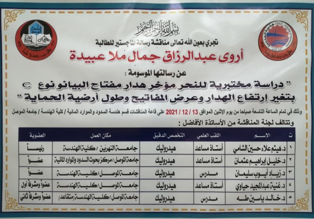 نوقشت رسالة ماجستير في قسم هندسة السدود والموارد المائية بجامعة الموصل بعنوان “دراسة مختبرية للنحر مؤخر هدار مفتاح البيانو نوع c بتغير ارتفاع الهدار وعرض المفاتيح وطول ارضية الحماية” للطالبة اروى عبد الرزاق جمال محمد في تمام الساعة التاسعة من يوم الاثنين الموافق 13/12/2021.