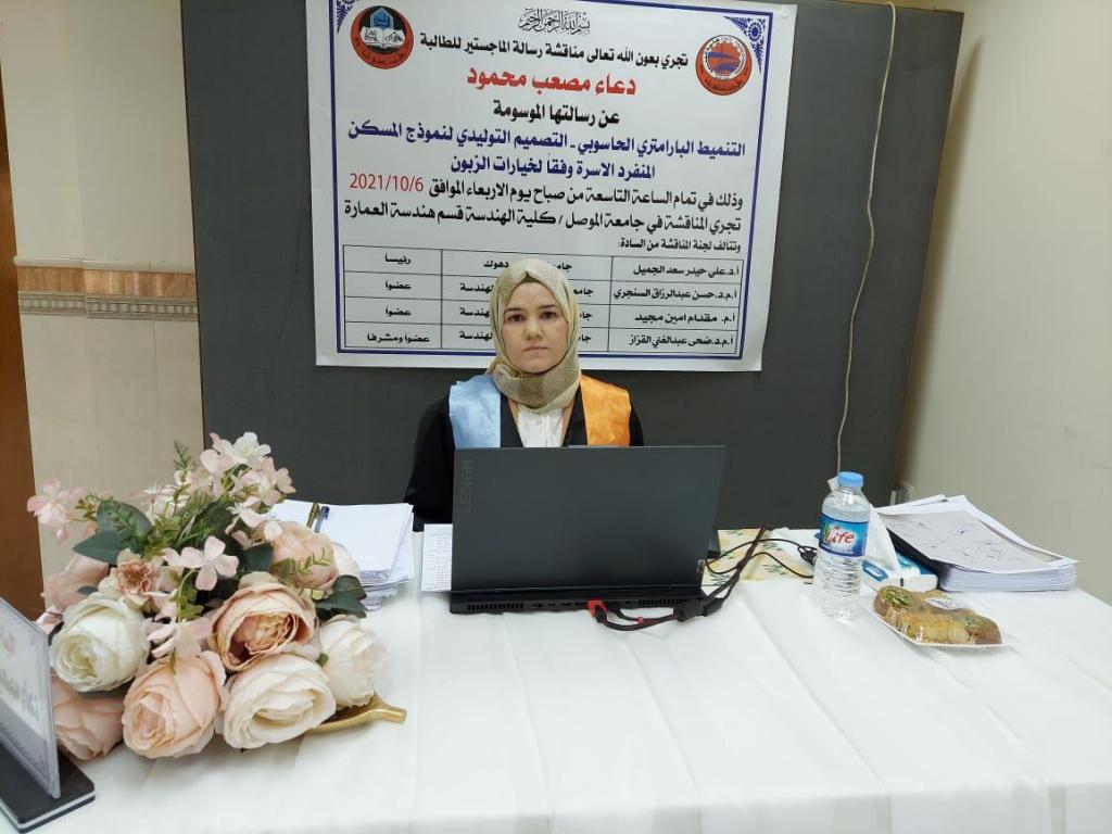 نوقشت رسالة الماجستير في كلية الهندسة قسم هندسة العمارة بجامعة الموصل بعنوان “التنميط البارامتري الحاسوبي – التصميم التوليدي لنموذج المسكن المنفرد الاسرة وفقا لخيارات الزبون” للطالبة دعاء مصعب محمود في تمام الساعة التاسعة من يوم الاربعاء الموافق 6/10/2021.