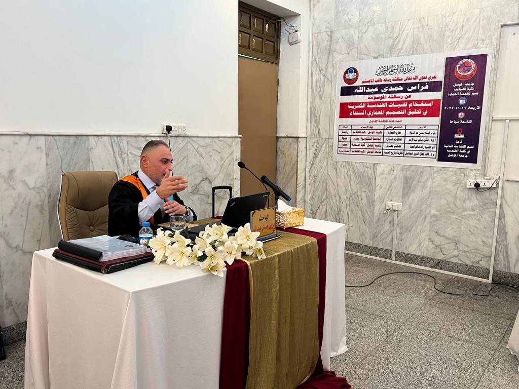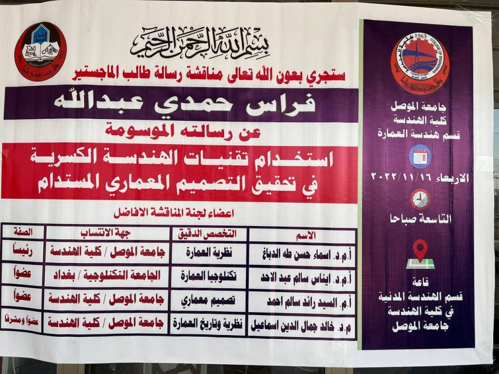 تمت مناقشة رسالة ماجستير في قسم هندسة العمارة بجامعة الموصل بعنوان “استخدام تقنيات الهندسة الكسرية في تحقيق التصميم المعماري المستدام” للطالب فراس حمدي عبدالله بإشراف م.د. خالد جمال الدين اسماعيل في تمام الساعة التاسعة من يوم الاربعاء الموافق 2022/11/16 على القاعة المدرجة لقسم الهندسة المدنية.