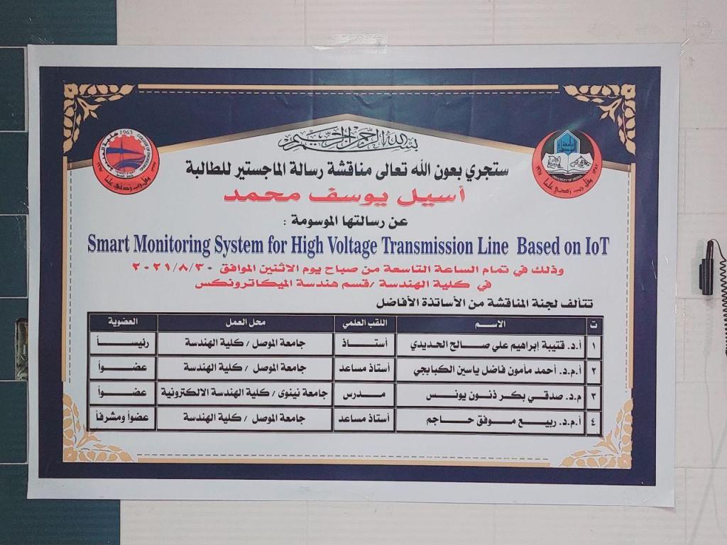 ناقش قسم هندسة الحاسوب في كلية الهندسة بجامعة الموصل رسالة ماجستير عن (نظام مراقبة ذكي لخط نقل الطاقة عالي الجهد بالإعتماد على إنترنت الأشياء) يوم 30 اب 2021 في قاعة مناقشات قسم هندسةالميكاترونكس. حضرها الأستاذ المساعد الدكتور أحمد مامون فاضل رئيس القسم وعدد من تدريسيي الكلية .