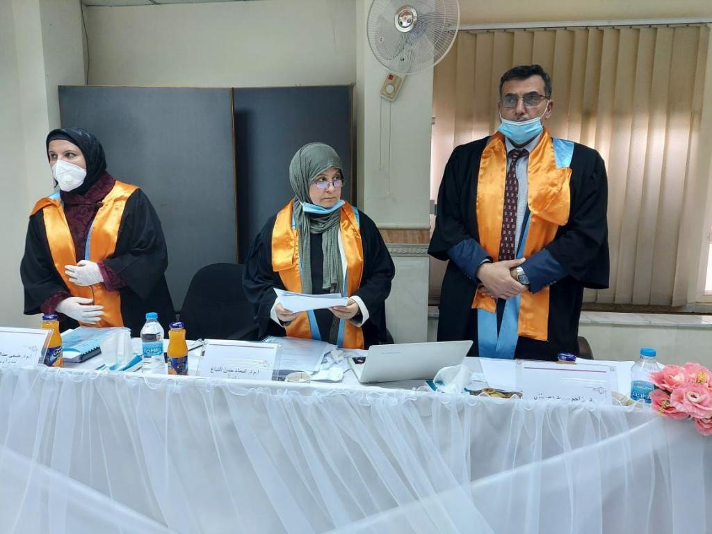 و قد تمت مناقشتها من قبل لجنة ترأسها الاستاذة المساعدة الدكتورة اسماء حسن الدباغ من جامعة الموصل) وتضم في عضويتها الاستاذ المساعد الدكتور صفاء الدين حسين علي من الجامعة التكنولوجية) و المدرس الدكتور مزاحم محمد مصطفى من جامعة الموصل) فضلا عن الاستاذة المساعدة الدكتورة ضحى عبد الغني القزاز من جامعة الموصل) عضوة و مشرفة.