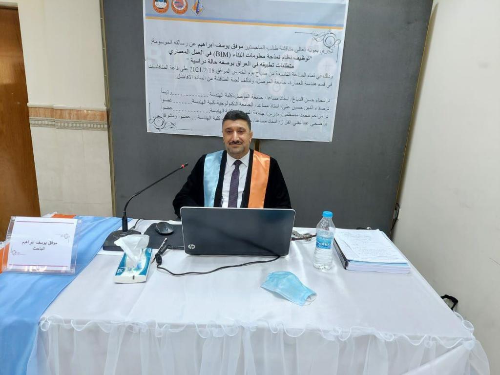 تمت مناقشة رسالة ماجستير تقدم بها الطالب موفق يوسف ابراهيم الى قسم هندسة العمارة في كلية الهندسة بجامعة الموصل تحت عنوان ( توظيف نظام نمذجة معلومات البناء ((BIM)) في العمل المعماري متطلبات تطبيقه في العراق بوصفه حالة دراسية ) صباح يوم الخميس الموافق 18/2/2021 توصلت هذه الرسالة الى ان الرؤية المستقبلية لإعداد معايير تطبيق نظام BIM في العراق تتضمن الجوانب المتماثلة بين معايير الدول التي يمكن استخدام وصوفاتها في المعيار العراقي والجوانب المتباينة التي تستلزم في إعدادها إضفاء خصوصية العراق، فضلاً عن تحديد المتطلبات التفصيلية لتطبيق نظام BIM 4D في المشاريع العمرانية في العراق.