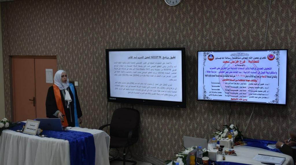 رسالة ماجستير في كلية الهندسة تناقش ” التحليل العددي لمراقبة تأثير السعات المتباينة من الخزين على التسرب واستقرارية الميول في السدود الترابية “