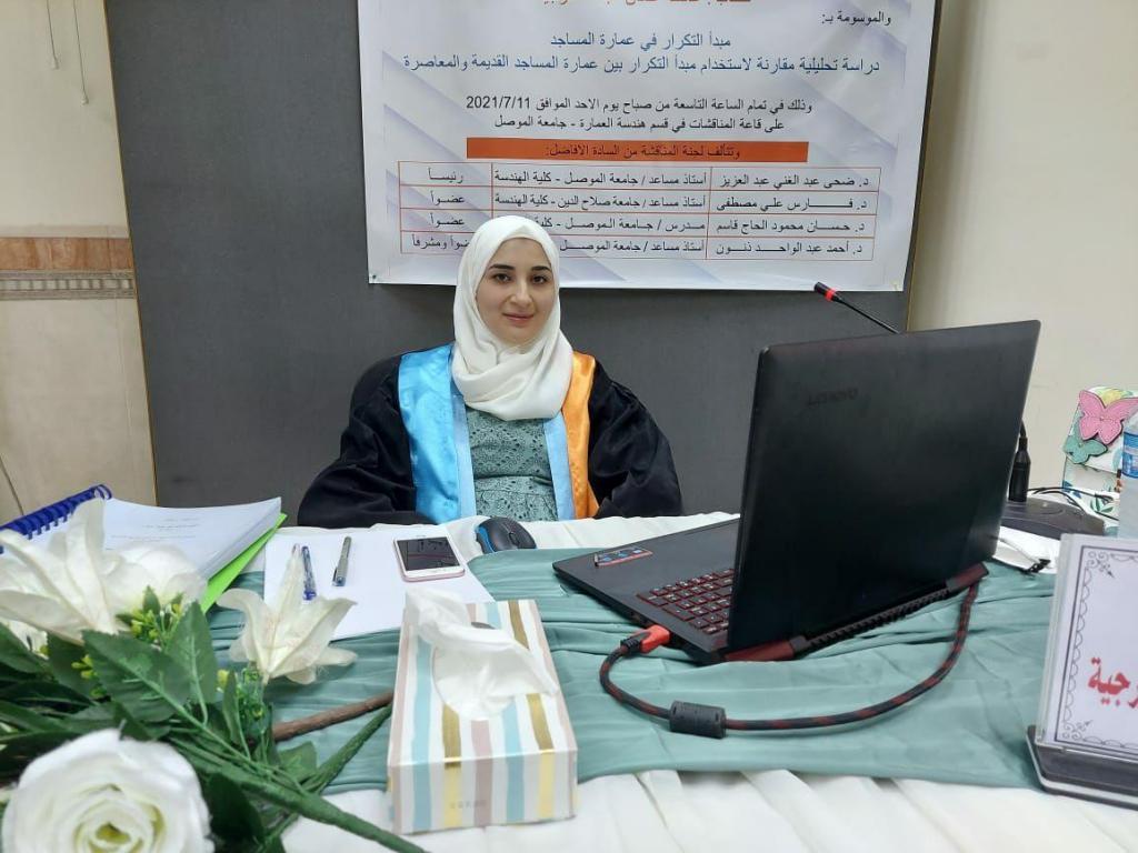 تمت مناقشة رسالة ماجستير تقدمت بها الى قسم هندسة العمارة في كلية الهندسة بجامعة الموصل الطالبة عائشة عدنان عبد الله وتحمل عنوان (مبدا التكرار في عمارة المساجد دراسة تحليلية مقارنة لاستخدام مبدا التكرار بين عمارة المساجد القديمة والمعاصرة) المناقشة تمت في الساعة التاسعة من يوم الاحد الموافق 2021/7/11