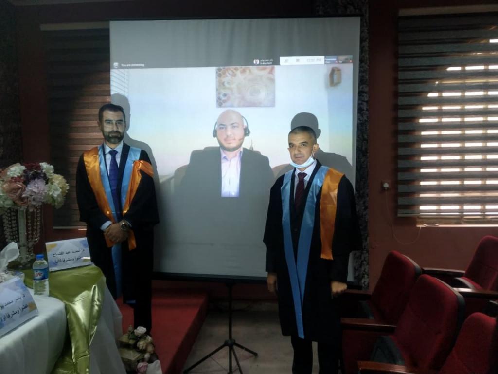 وقد تألفت لجنة المناقشة من أ.د عبد الغني عبد الرزاق عبد الغفور رئيسا وعضوية كل من أ.م.د احمد نصر بهجت السماك عضوا و أ.م.د حسين ابزار زينل عضوا و الدكتور ياسر محمد يونس عضوا و مشرفا” اولا” والدكتور احمد عبد الفتاح عضوا ومشرفا” ثانيا”
