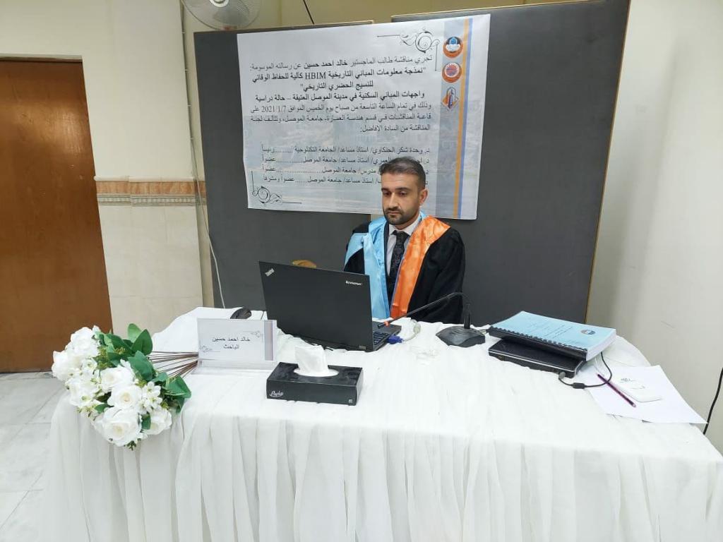 ناقشت رسالة الماجستير في كلية الهندسة قسم هندسة العمارة بجامعة الموصل ( نمذجة معلومات المباني التاريخية HBIM كآلية للحفاظ الوقائي للنسيج الحضري التاريخي- واجهات المباني السكنية في مدينة الموصل العتيقة – حالة دراسية ) للطالب خالد احمد حسين في تمام الساعة التاسعة من يوم الخميس الموافق 2021/1/7.