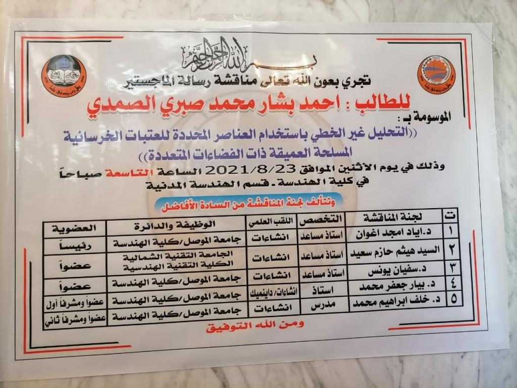 نوقشت رسالة الماجستير في قسم الهندسة المدنية / كلية الهندسة / جامعة الموصل والموسومة ب (التحليل غير الخطي باستخدام العناصر المحددة للعتبات الخرسانية المسلحة العميقة ذات الفضاءات المتعددة) يوم الاثنين الموافق(23/8/2021) في قاعة المناقشة في القسم، حضر جانبا منها الأستاذ الدكتور عبد الرحيم ابراهيم جاسم رئيس قسم الهندسة المدنية وعدد من تدريسيي القسم. تناولت الرسالة التي تقدم بها الطالب احمد بشار محمد في فرع الانشاءات تطبيق طريقة العناصر المحددة باستخدام برنامج (ANSYS 2020) في التحليل العددي للعتبات الخرسانية المسلحة العميقة. تهدف الرسالة الى تمثيل الخرسانة المسلحة باستخدام العنصر الطابوقي (SOLID 56) وتمثيل الصفائح الحديدية باستخدام العنصر (SOLID 185) في حين تم تمثيل حديد التسليح بالعنصر (LINK 180) مع الأخذ بنظر الاعتبار التصرف غير الخطي لكل من الخرسانة وحديد التسليح. توصلت الرسالة الى ان حمل الفشل في العتبات الخرسانية المسلحة العميقة يعتمد على نسبة فضاء القص الى العمق كذلك تبين ان معامل الصلابة مهم جدا للحصول على الاستقرارية عند استخدام التحليل العددي. أوصت الرسالة بضرورة دراسة تصرف العتبات الخرسانية المسلحة العميقة ذات المساند المرنة تحت الأحمال غير المركزية بوجود الفتحات. ترأس لجنة المناقشة الأستاذ المساعد الدكتور اياد امجد اغوان وشغل عضويتها كل من الأستاذ المساعد الدكتور سفيان يونس احمد والأستاذ المساعد هيثم حازم سعيد وبإشراف وعضوية كل من الأستاذ الدكتور بيار جعفر محمد والمدرس الدكتور خلف ابراهيم محمد.