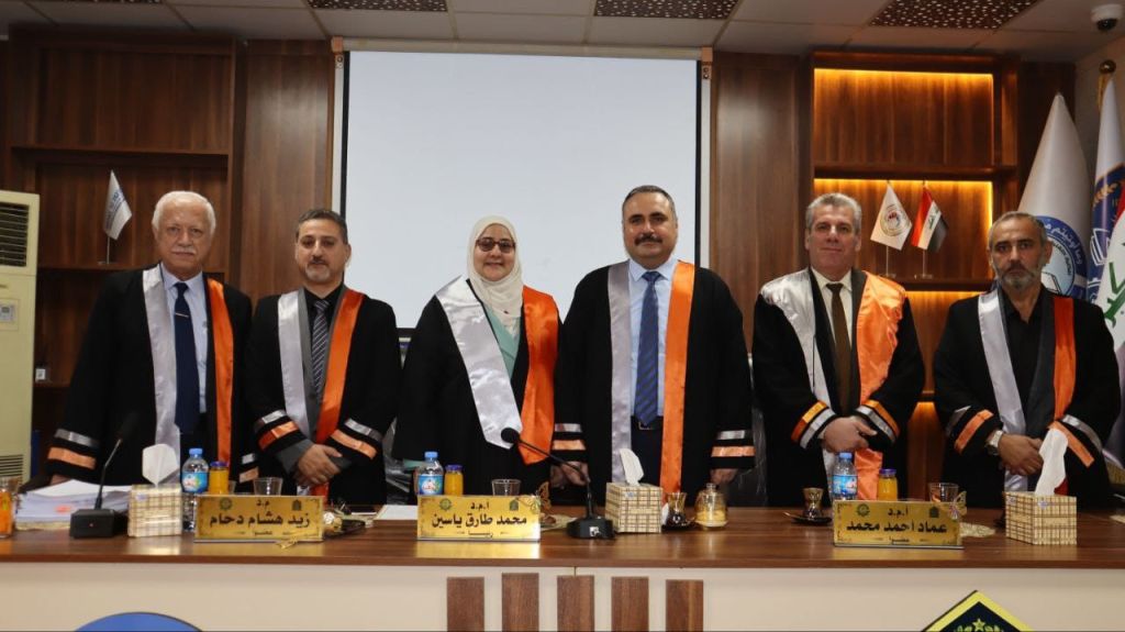 ترأس لجنة المناقشة الأستاذ المساعد الدكتور عماد هاني اسماعيل، وعضوية كل من الاستاذ المساعد الدكتورة ضحى عبد الغني عبد العزيز والمدرس الدكتور سمعان مجيد ياس/ كلية الهندسة-جامعة ديالى)، والاستاذ الدكتور حسان محمود قاسم عضوا ومشرفا.