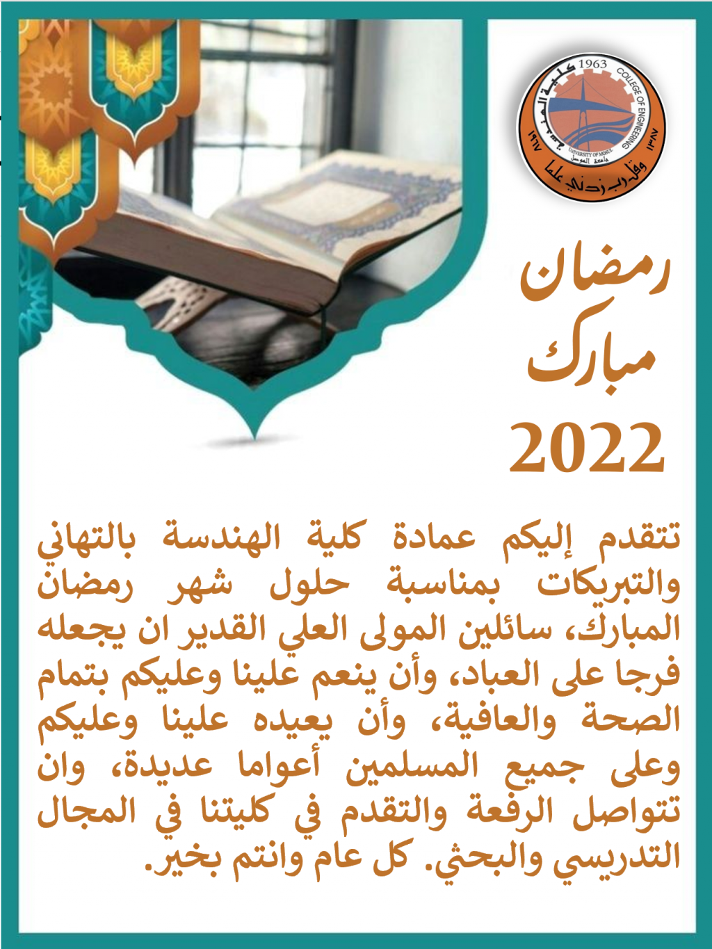 تتقدم إليكم عمادة كلية الهندسة بالتهاني والتبريكات بمناسبة حلول شهر رمضان المبارك، سائلين المولى العلي القدير ان يجعله فرجا على العباد، وأن ينعم علينا وعليكم بتمام الصحة والعافية، وأن يعيده علينا وعليكم وعلى جميع المسلمين أعواما عديدة، وان تتواصل الرفعة والتقدم في كليتنا في المجال التدريسي والبحثي. كل علم وانتم بخير.