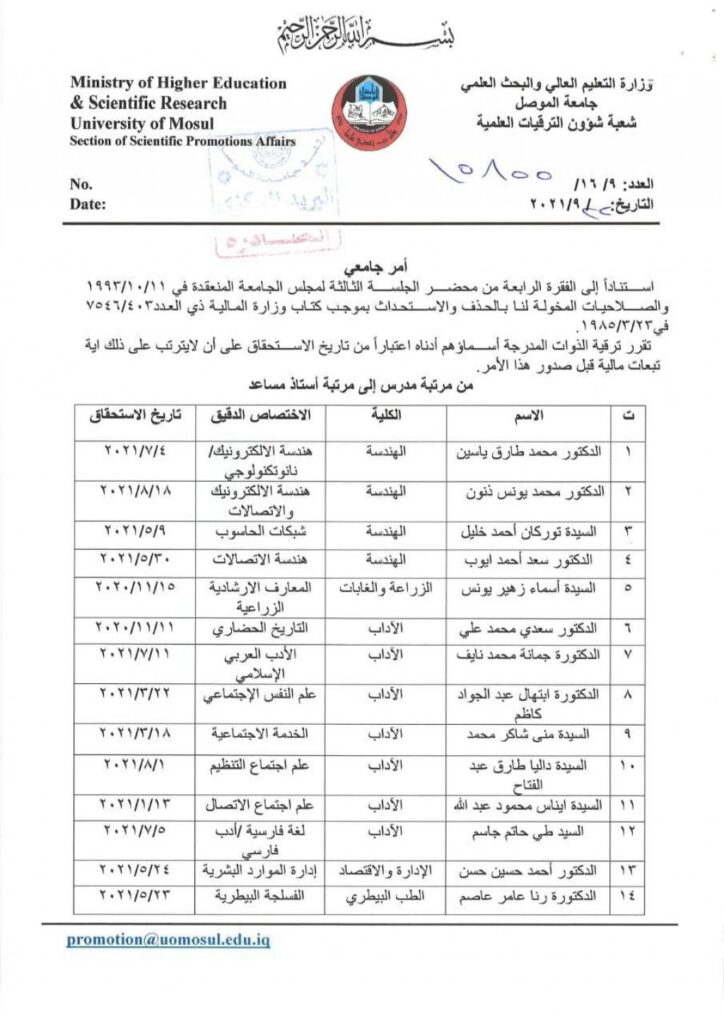 ترقية علمية لعدد من الكادر التدريسي لكلية الهندسة الى مرتبة استاذ مساعد