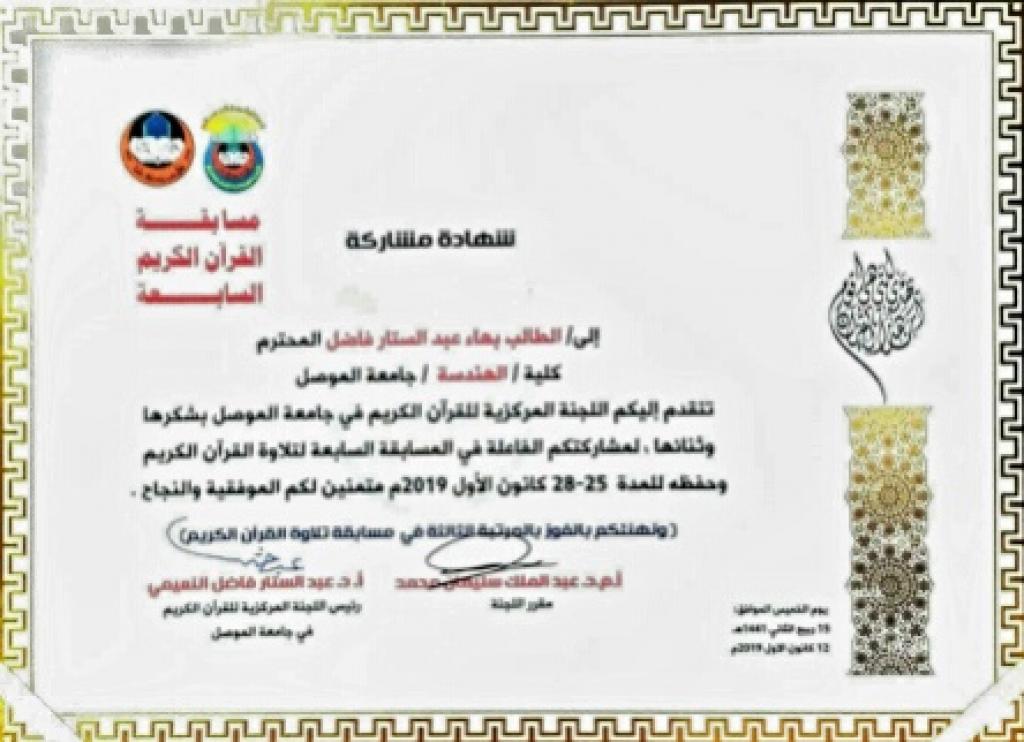حصول الطالب( بهاء عبد الستار فاضل) على المرتبة الثالثة*تلاوة* في مسابقة القرآن الكريم السابعة والتي أقيمت في قسم علوم القرآن والتربية الاسلامية – كلية التربية – جامعة الموصل وللفترة من 25-11-2019 ولغاية 28-11-2019 . علما ان الطالب المذكور آنفاً هو أحد طلبة كلية الهندسة- قسم العمارة – المرحلة الثالثة.