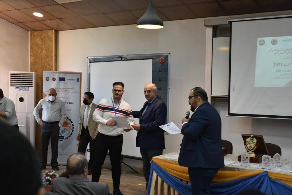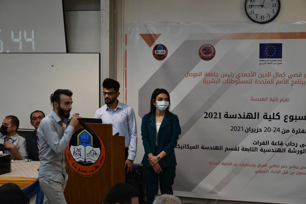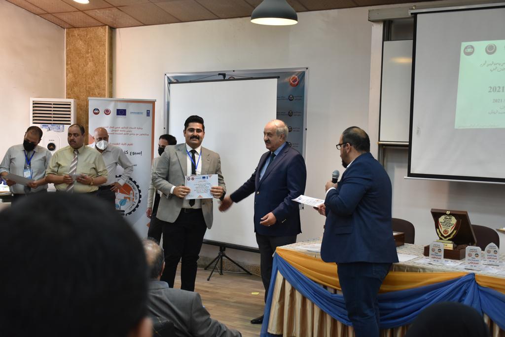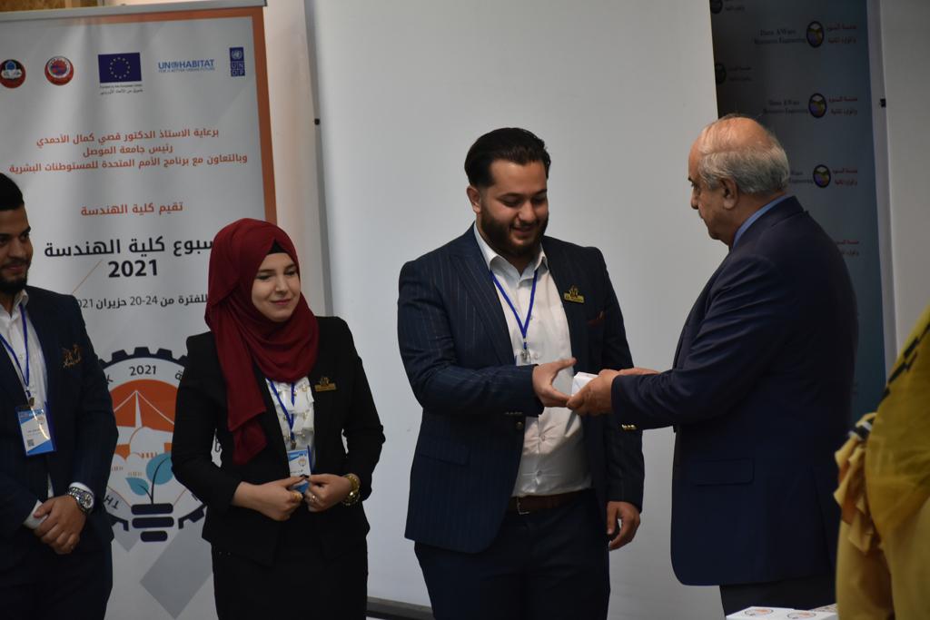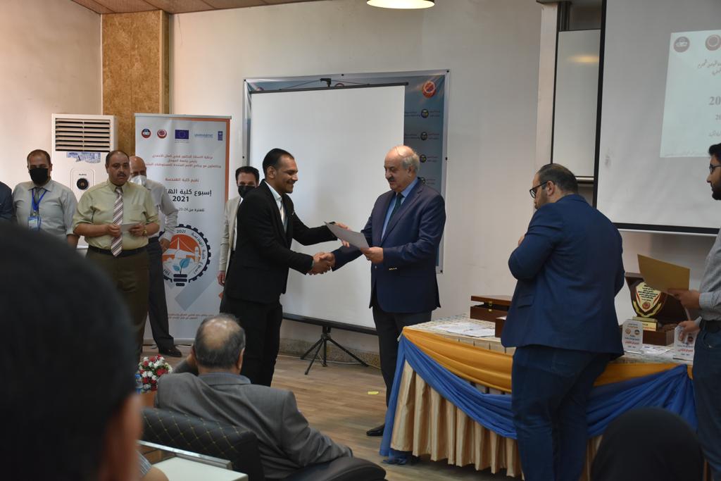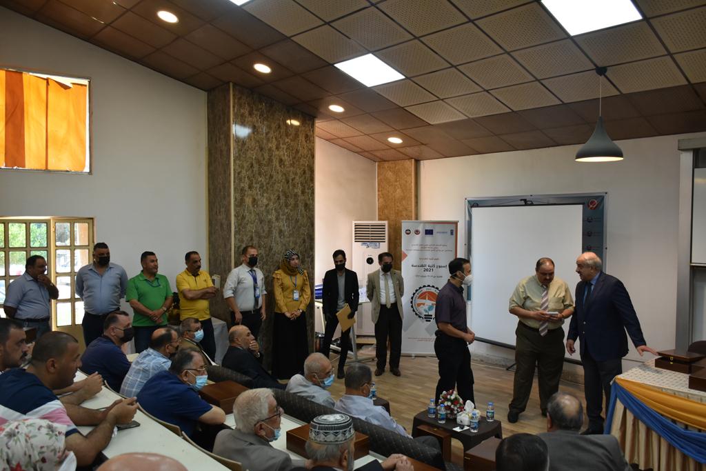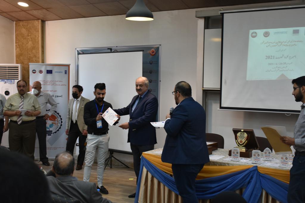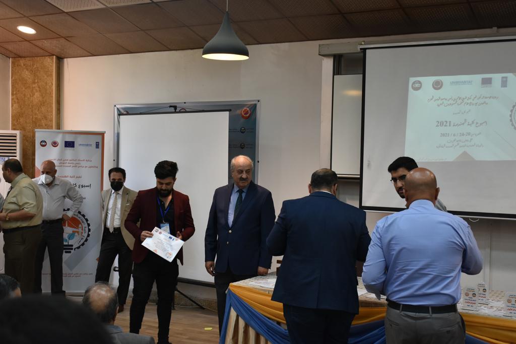 بدأت فعاليات اليوم الخامس بمحاضرة لمسؤولين من المكتب الاستشاري الهندسي هما الدكتور سعد زغلول والدكتور عدي عسل بعنوان “دور المكتب الاستشاري في المشاريع الهندسية واهميته في تطوير الخبرات وامكانيات الكادر التدريسي”. تبعتها كلمة ترحيبية الكترونية من قبل السيدة غادة حميد ممثلة الاتحاد الأوربي أشادت فيها بفعاليات الأسبوع وتمنت فيها المزيد من التعاون بين الكلية والاتحاد.عند الساعة العاشرة والنصف بدأت فعاليات التكريم لنخبة من التدريسيين المتقاعدين بحضورهم او من ينوب عنهم حيث قدم عميد كلية الهندسة الاستاذ الدكتور بيار جعفر السليفاني درع تكريم وفاءً لمسيرتهم الإدارية والتدريسية الطويلة. وهم كل من:الاستاذ المساعد محمد سليمان حسن ابراهيم الغبشةالدكتور قيدار مجيد قدو صالح قبعالدكتور ضياء علي بشير محمد النعمةالاستاذ الدكتور فاروق خليل عموري عبد الله العموريالدكتورة ايمان حازم شيت بهنامالدكتور طارق عبد الله خلفالدكتور مؤيد سعدالله خليل حياويالاستاذ الدكتور عبد الحكيم حامد احمد العزوالاستاذ الدكتور علي حيدر سعد علي الجميلالاستاذ الدكتورة حفصة رمزي محمد صديق العمريالدكتور مظفر انور النعمةالدكتور ثامر صابر يونسالاستاذ الدكتور برهان محمود احمد حسين العليالاستاذ الدكتور سعد علي حسن احمد الطعانالاستاذ الدكتور خالد عبد العزيز عبد الفتاح حسن زكريااعقبها قيام السيد العميد أيضا بتكريم أفراد المنظمة المساهمة في هذا الحدث برئاسة السيدة اننا سوافي، ثم من ينوب عن الشركات المشاركة في المعرض المفتوح ثم اللجنة التحضيرية والفرعية المنجزة لاسبوع كلية الهندسة 2021 ثم تكريم للتدريسيين والموظفين المتميزين في عمادة كلية الهندسة وكل الأقسام ثم تكريم الفائزين بالمراتب الثلاث الأولى في منافسات مسابقة الشطرنج.الفقرة الأخيرة كانت فعالية طلابية في قاعة الفرات بدأت بإستكمال مسابقة المعلومات العامة حيث كان المتسابقون من هندسة البيئة والهندسة الكهربائية، حيث فاز فريق هندسة البيئة وتم تكريمهم بجوائز.اعقبها المسابقة النهائية لمشاريع التخرج لأقسام كلية الهندسة حيث كانت المسابقة ترشيح أفضل اثنين او ثلاثة من المشاريع المشاركين بالمعرض المفتوح.المسابقة كانت ثلاث دقائق فقط لكل مشروع ليتم عرضه للجنة التحكيم ويعقبها سؤالين فقط من قبل اللجنة والجمهور ليتم معرفة قدرة الطلبة وقابليتهم على الشرح والايضاح ليتم فوز مجموعة من المشاريع بمجموعة من النقاط المحددة من قبل لجنة التحكيم بجوائز عددها عشرون جائزة.وبهذا انتهت فعاليات أسبوع كلية الهندسة 2021 بتوفيق من الله.