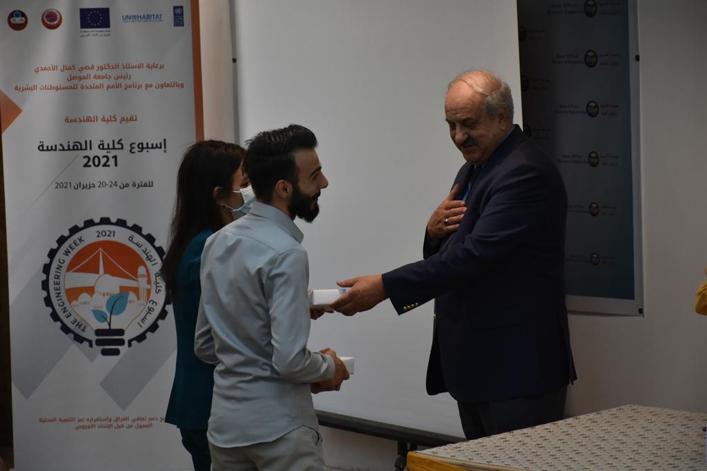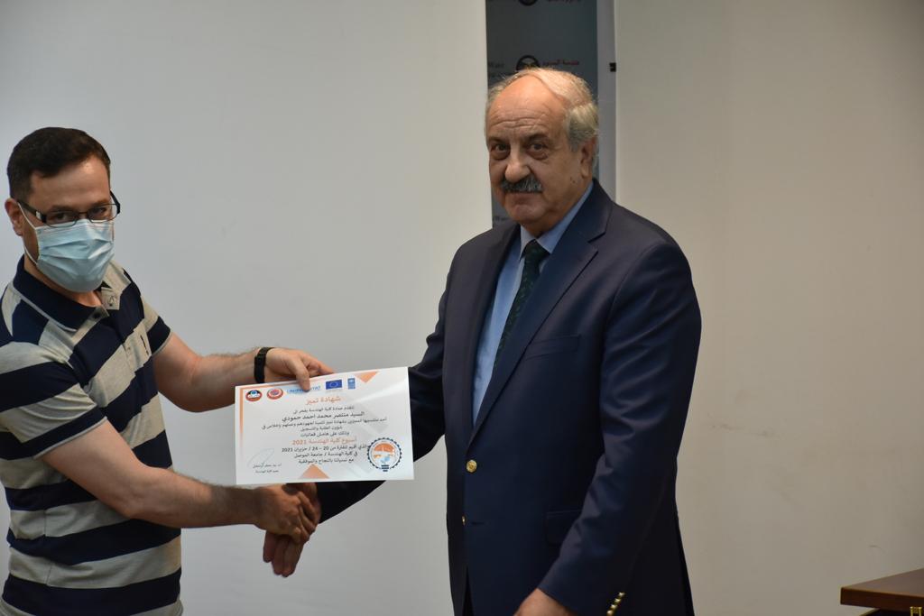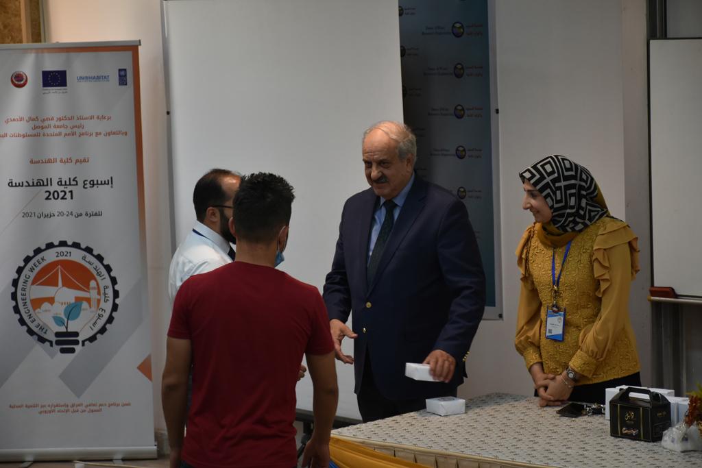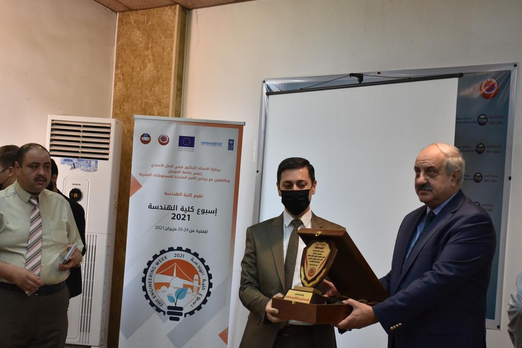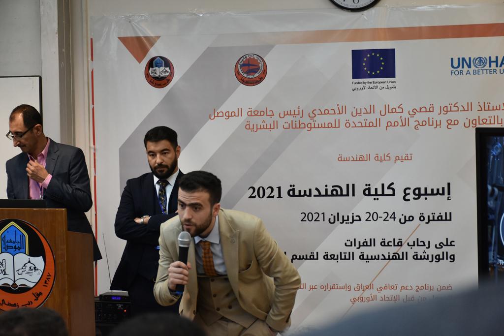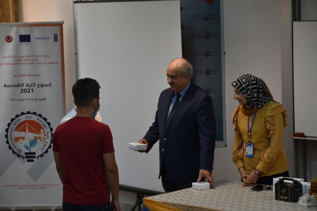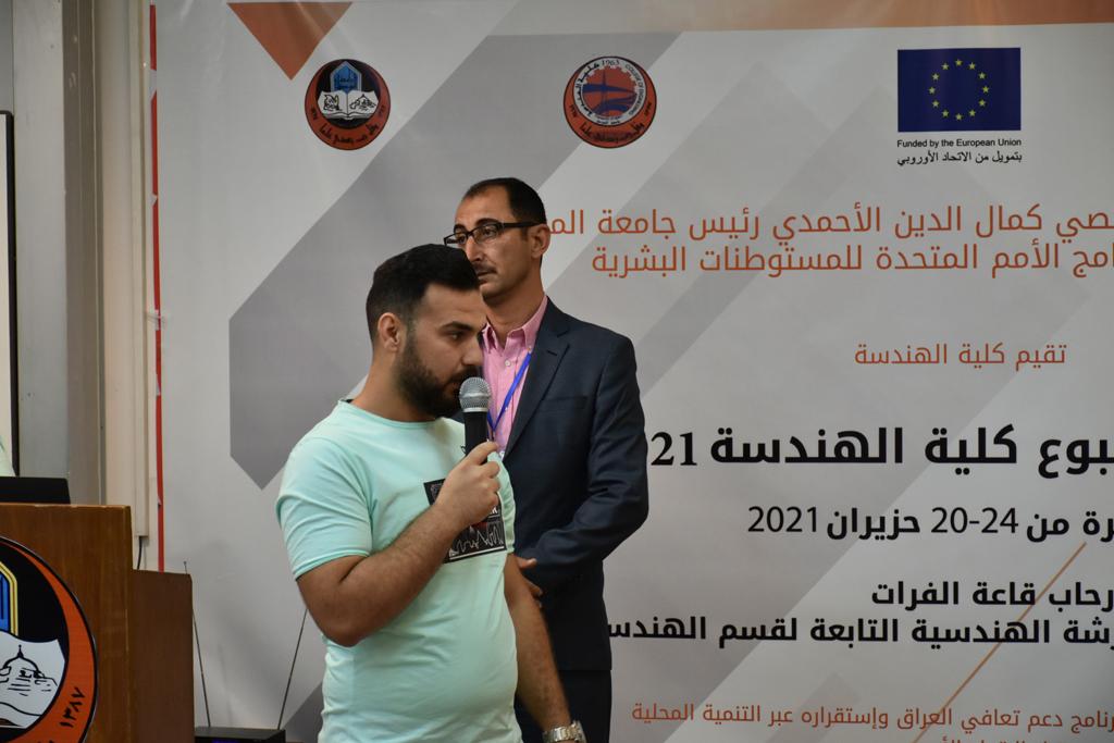 بدأت فعاليات اليوم الخامس بمحاضرة لمسؤولين من المكتب الاستشاري الهندسي هما الدكتور سعد زغلول والدكتور عدي عسل بعنوان “دور المكتب الاستشاري في المشاريع الهندسية واهميته في تطوير الخبرات وامكانيات الكادر التدريسي”. تبعتها كلمة ترحيبية الكترونية من قبل السيدة غادة حميد ممثلة الاتحاد الأوربي أشادت فيها بفعاليات الأسبوع وتمنت فيها المزيد من التعاون بين الكلية والاتحاد.عند الساعة العاشرة والنصف بدأت فعاليات التكريم لنخبة من التدريسيين المتقاعدين بحضورهم او من ينوب عنهم حيث قدم عميد كلية الهندسة الاستاذ الدكتور بيار جعفر السليفاني درع تكريم وفاءً لمسيرتهم الإدارية والتدريسية الطويلة. وهم كل من:الاستاذ المساعد محمد سليمان حسن ابراهيم الغبشةالدكتور قيدار مجيد قدو صالح قبعالدكتور ضياء علي بشير محمد النعمةالاستاذ الدكتور فاروق خليل عموري عبد الله العموريالدكتورة ايمان حازم شيت بهنامالدكتور طارق عبد الله خلفالدكتور مؤيد سعدالله خليل حياويالاستاذ الدكتور عبد الحكيم حامد احمد العزوالاستاذ الدكتور علي حيدر سعد علي الجميلالاستاذ الدكتورة حفصة رمزي محمد صديق العمريالدكتور مظفر انور النعمةالدكتور ثامر صابر يونسالاستاذ الدكتور برهان محمود احمد حسين العليالاستاذ الدكتور سعد علي حسن احمد الطعانالاستاذ الدكتور خالد عبد العزيز عبد الفتاح حسن زكريااعقبها قيام السيد العميد أيضا بتكريم أفراد المنظمة المساهمة في هذا الحدث برئاسة السيدة اننا سوافي، ثم من ينوب عن الشركات المشاركة في المعرض المفتوح ثم اللجنة التحضيرية والفرعية المنجزة لاسبوع كلية الهندسة 2021 ثم تكريم للتدريسيين والموظفين المتميزين في عمادة كلية الهندسة وكل الأقسام ثم تكريم الفائزين بالمراتب الثلاث الأولى في منافسات مسابقة الشطرنج.الفقرة الأخيرة كانت فعالية طلابية في قاعة الفرات بدأت بإستكمال مسابقة المعلومات العامة حيث كان المتسابقون من هندسة البيئة والهندسة الكهربائية، حيث فاز فريق هندسة البيئة وتم تكريمهم بجوائز.اعقبها المسابقة النهائية لمشاريع التخرج لأقسام كلية الهندسة حيث كانت المسابقة ترشيح أفضل اثنين او ثلاثة من المشاريع المشاركين بالمعرض المفتوح.المسابقة كانت ثلاث دقائق فقط لكل مشروع ليتم عرضه للجنة التحكيم ويعقبها سؤالين فقط من قبل اللجنة والجمهور ليتم معرفة قدرة الطلبة وقابليتهم على الشرح والايضاح ليتم فوز مجموعة من المشاريع بمجموعة من النقاط المحددة من قبل لجنة التحكيم بجوائز عددها عشرون جائزة.وبهذا انتهت فعاليات أسبوع كلية الهندسة 2021 بتوفيق من الله.