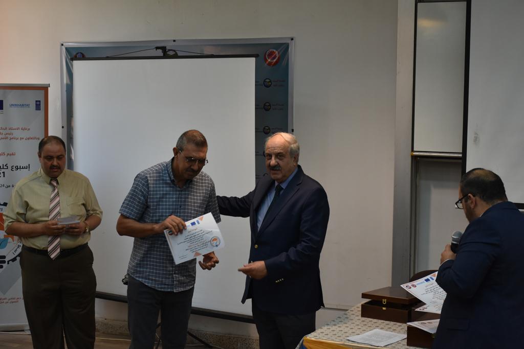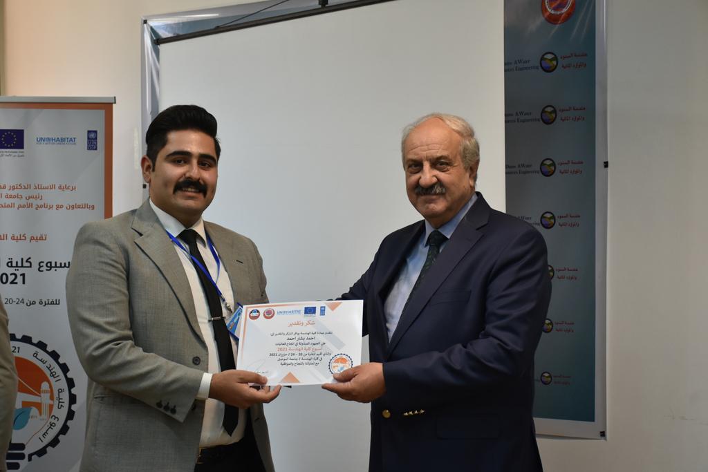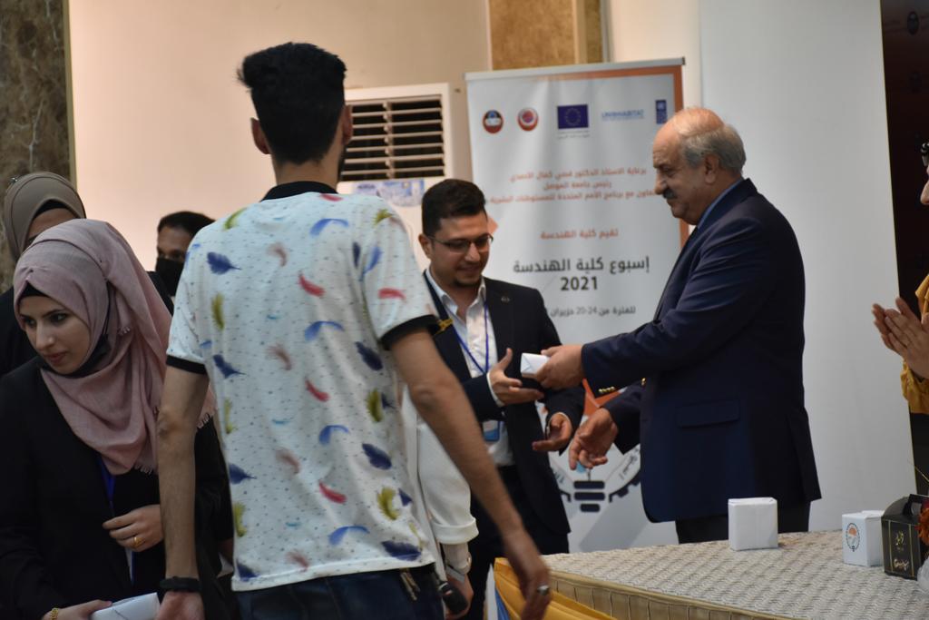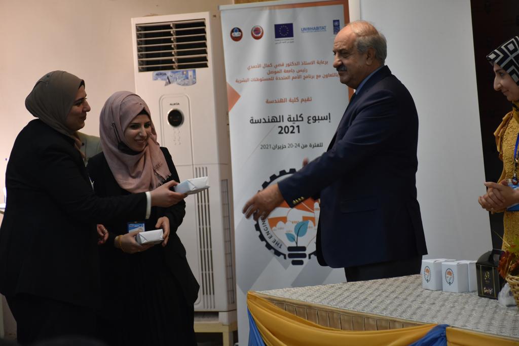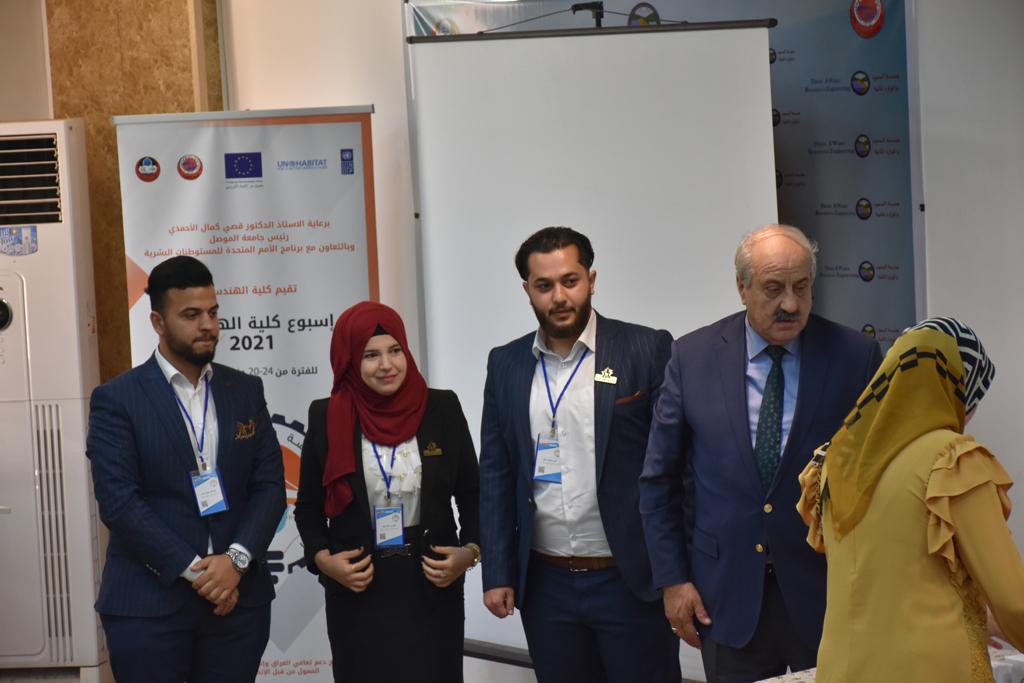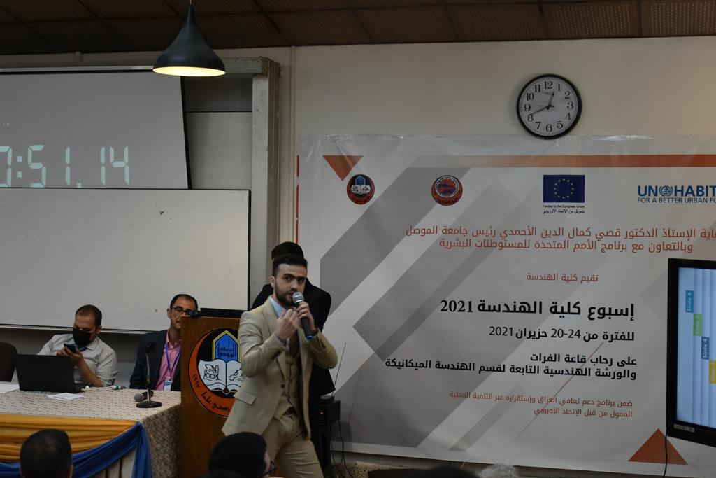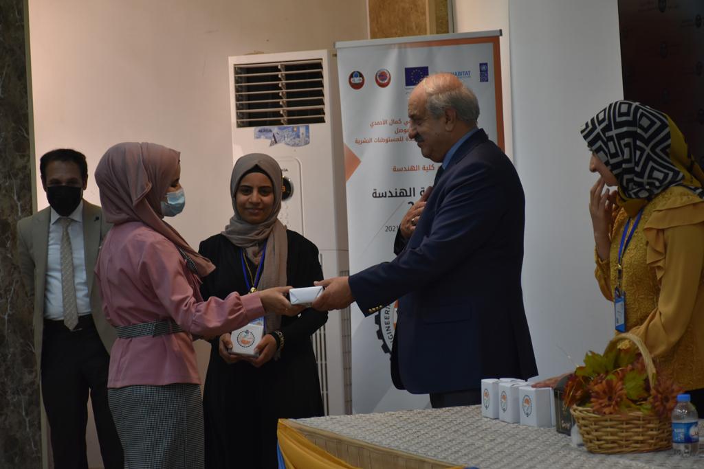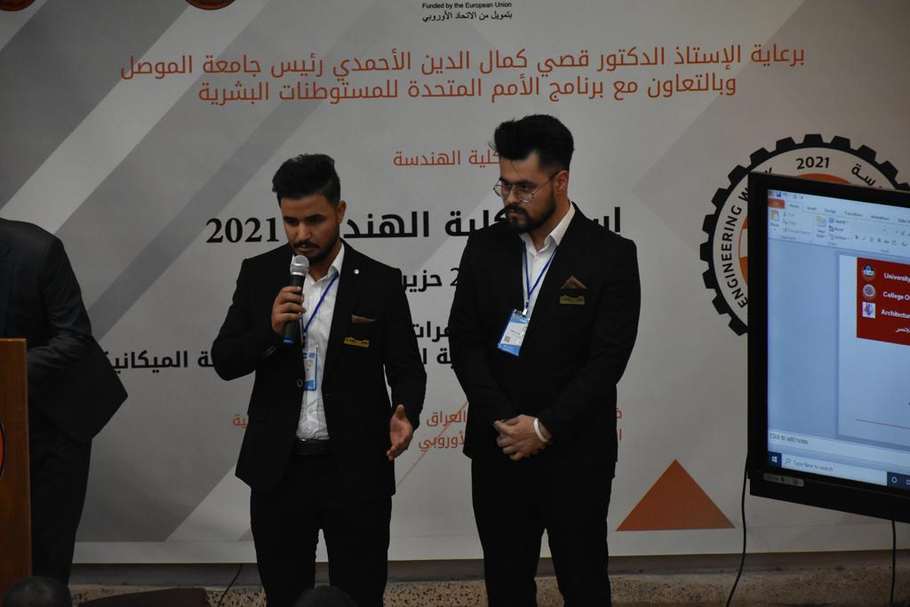 بدأت فعاليات اليوم الخامس بمحاضرة لمسؤولين من المكتب الاستشاري الهندسي هما الدكتور سعد زغلول والدكتور عدي عسل بعنوان “دور المكتب الاستشاري في المشاريع الهندسية واهميته في تطوير الخبرات وامكانيات الكادر التدريسي”. تبعتها كلمة ترحيبية الكترونية من قبل السيدة غادة حميد ممثلة الاتحاد الأوربي أشادت فيها بفعاليات الأسبوع وتمنت فيها المزيد من التعاون بين الكلية والاتحاد.عند الساعة العاشرة والنصف بدأت فعاليات التكريم لنخبة من التدريسيين المتقاعدين بحضورهم او من ينوب عنهم حيث قدم عميد كلية الهندسة الاستاذ الدكتور بيار جعفر السليفاني درع تكريم وفاءً لمسيرتهم الإدارية والتدريسية الطويلة. وهم كل من:الاستاذ المساعد محمد سليمان حسن ابراهيم الغبشةالدكتور قيدار مجيد قدو صالح قبعالدكتور ضياء علي بشير محمد النعمةالاستاذ الدكتور فاروق خليل عموري عبد الله العموريالدكتورة ايمان حازم شيت بهنامالدكتور طارق عبد الله خلفالدكتور مؤيد سعدالله خليل حياويالاستاذ الدكتور عبد الحكيم حامد احمد العزوالاستاذ الدكتور علي حيدر سعد علي الجميلالاستاذ الدكتورة حفصة رمزي محمد صديق العمريالدكتور مظفر انور النعمةالدكتور ثامر صابر يونسالاستاذ الدكتور برهان محمود احمد حسين العليالاستاذ الدكتور سعد علي حسن احمد الطعانالاستاذ الدكتور خالد عبد العزيز عبد الفتاح حسن زكريااعقبها قيام السيد العميد أيضا بتكريم أفراد المنظمة المساهمة في هذا الحدث برئاسة السيدة اننا سوافي، ثم من ينوب عن الشركات المشاركة في المعرض المفتوح ثم اللجنة التحضيرية والفرعية المنجزة لاسبوع كلية الهندسة 2021 ثم تكريم للتدريسيين والموظفين المتميزين في عمادة كلية الهندسة وكل الأقسام ثم تكريم الفائزين بالمراتب الثلاث الأولى في منافسات مسابقة الشطرنج.الفقرة الأخيرة كانت فعالية طلابية في قاعة الفرات بدأت بإستكمال مسابقة المعلومات العامة حيث كان المتسابقون من هندسة البيئة والهندسة الكهربائية، حيث فاز فريق هندسة البيئة وتم تكريمهم بجوائز.اعقبها المسابقة النهائية لمشاريع التخرج لأقسام كلية الهندسة حيث كانت المسابقة ترشيح أفضل اثنين او ثلاثة من المشاريع المشاركين بالمعرض المفتوح.المسابقة كانت ثلاث دقائق فقط لكل مشروع ليتم عرضه للجنة التحكيم ويعقبها سؤالين فقط من قبل اللجنة والجمهور ليتم معرفة قدرة الطلبة وقابليتهم على الشرح والايضاح ليتم فوز مجموعة من المشاريع بمجموعة من النقاط المحددة من قبل لجنة التحكيم بجوائز عددها عشرون جائزة.وبهذا انتهت فعاليات أسبوع كلية الهندسة 2021 بتوفيق من الله.
