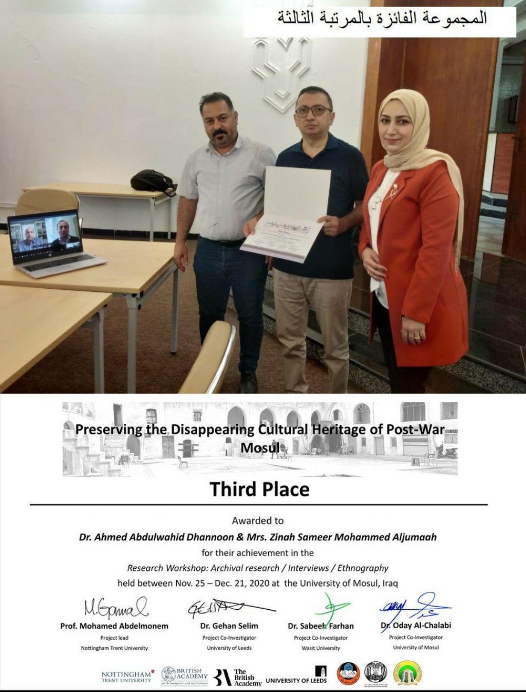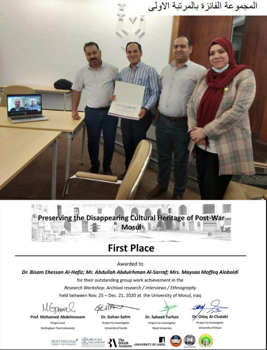حاز اساتذة من قسم هندسة العمارة على المرتبة الاولى والمرتبة الثالثة في المسابقة التي نظمتها جامعة نوتنكهام ترينت في المملكة المتحدة بالتعاون مع جامعة الموصل ضمن مشروع (الحفاظ على التراث الثقافي المتلاشي في الموصل ما بعد الحرب) والمدعوم من قبل كل من جامعة نوتنكهام ترينت وجامعة ليدز في المملكة المتحدة و جامعة الموصل وجامعة واسط وهيئة الاثار العراقية , اذ حازت المجموعة الاولى برئاسة الدكتور بسام احسان الحافظ وكل من الست ميساء موفق والسيد عبد الله عبد الرحمن على المركز الاول , كما حازت المجموعة الثانية برئاسة الدكتور احمد عبد الواحد والسيدة زينة سمير على المرتبة الثالثة …. تم منح الجوائز للفائزين ضمن اجتماع عقد في المنتدى العلمي والادبي لجامعة الموصل بحضور كل من البروفسور محمد جمال عبدالمنعم رئيس المشروع و الباحث الدكتور عمر ارشد من جامعة نوتنكهام ترينت في المملكة المتحدة (الكترونيا) والدكتور عدي قصي الجلبي رئيس الفريق البحثي في جامعة الموصل.
