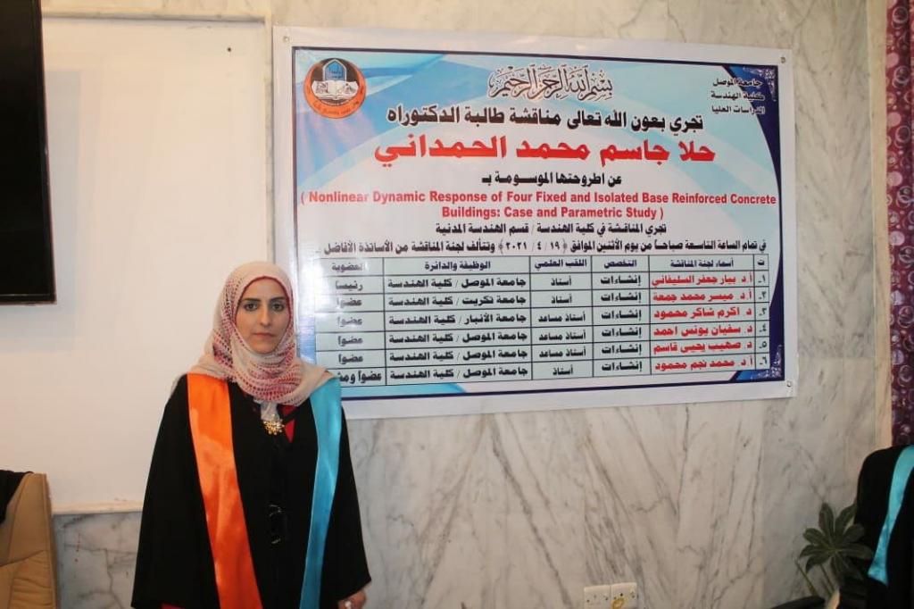بحضور الاستاذ الدكتور منير طه البدراني مساعد رئيس جامعة الموصل للشؤون العلمية تمت مناقشة اطروحة دكتوراه تقدمت بها الطالبة حلا جاسم محمد الى قسم الهندسة المدنية في كلية الهندسة هو (الإستجابة الديناميكية غير الخطية لأربعة مبان خرسانية مسلحة ذات قواعد ثابتة ومعزولة:دراسة حالة وتأثير متغيرات) وذلك في الساعة التاسعة صباحا من يوم الإثنين الموافق (19/4/2021) وفي رحاب قاعة المناقشة في قسم الهندسة المدنية.